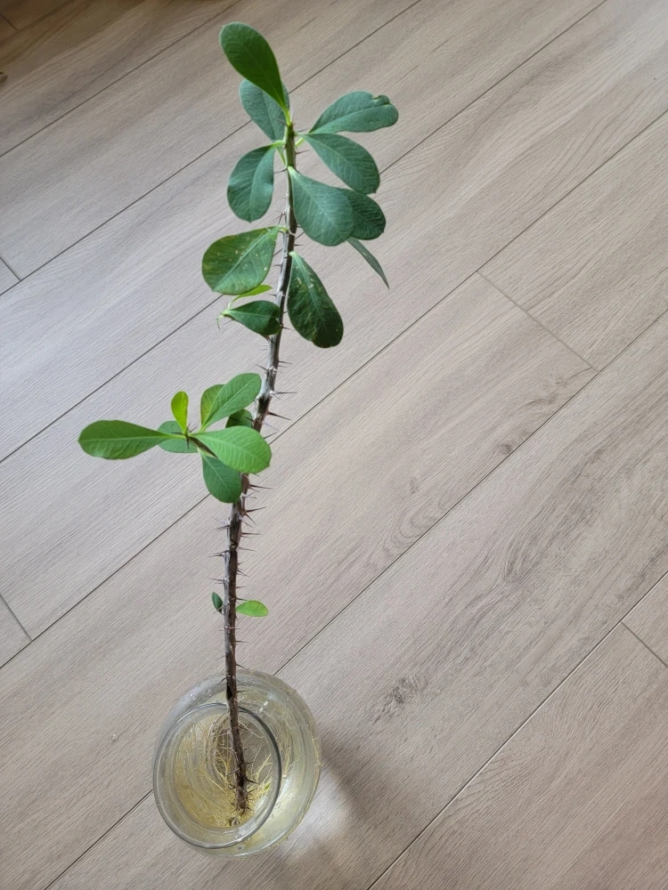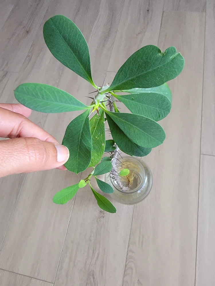 Selling a healthy Crown of Thorns plant! It's currently in a glass vase with water to encourage root growth. This plant is known for its unique thorns and beautiful flowers when it blooms. It would make a great addition to any indoor garden
