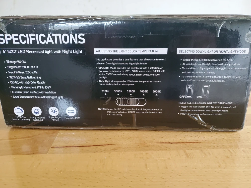 Selling a brand new INCARLED 4 inch 5CCT LED recessed light with night light! This is a 12 pack. It has 5CCT color temperature selectable. Super bright at 750LM. It is also dimmable!