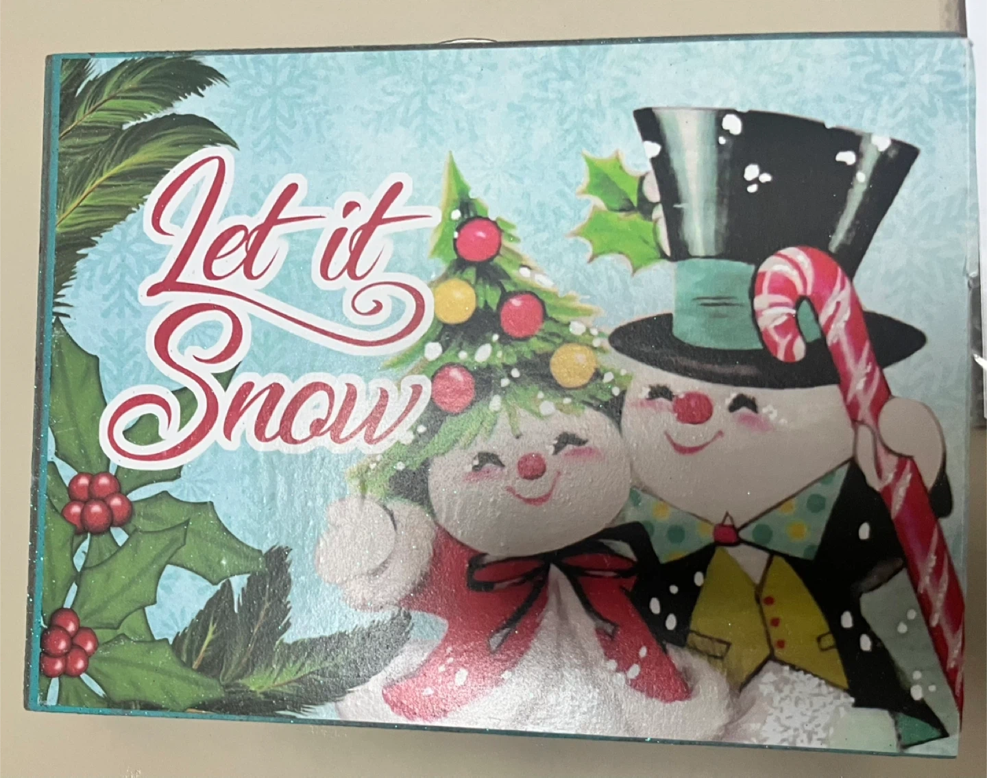 This is a cute little 'Let It Snow' Christmas decoration, perfect for adding a festive touch to your home this holiday season! It features a cheerful snowman couple and festive holly details. The sides are covered in green glitter for an extra sparkle