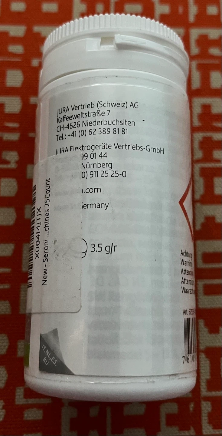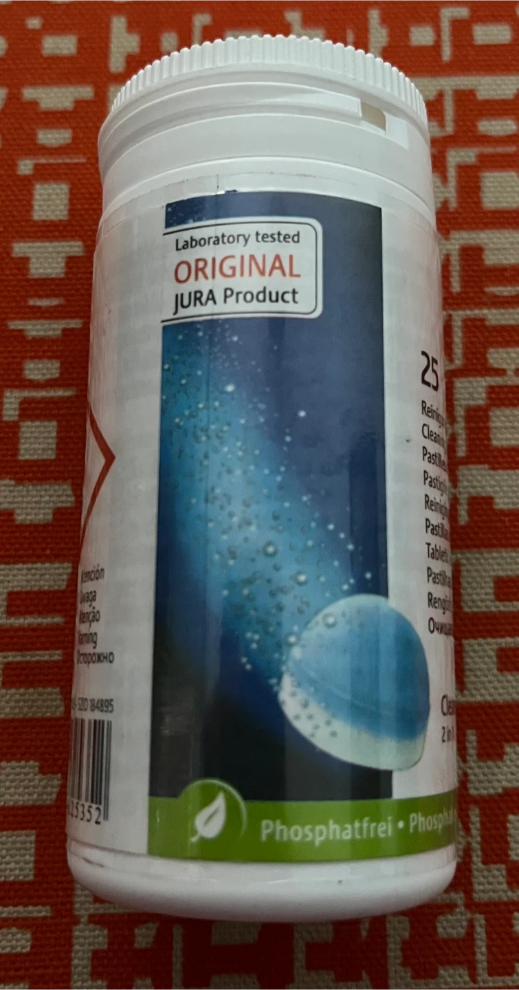 Selling a container of Jura cleaning tablets. These tablets are designed to clean and protect your Jura coffee machine. The container includes 25 tablets.