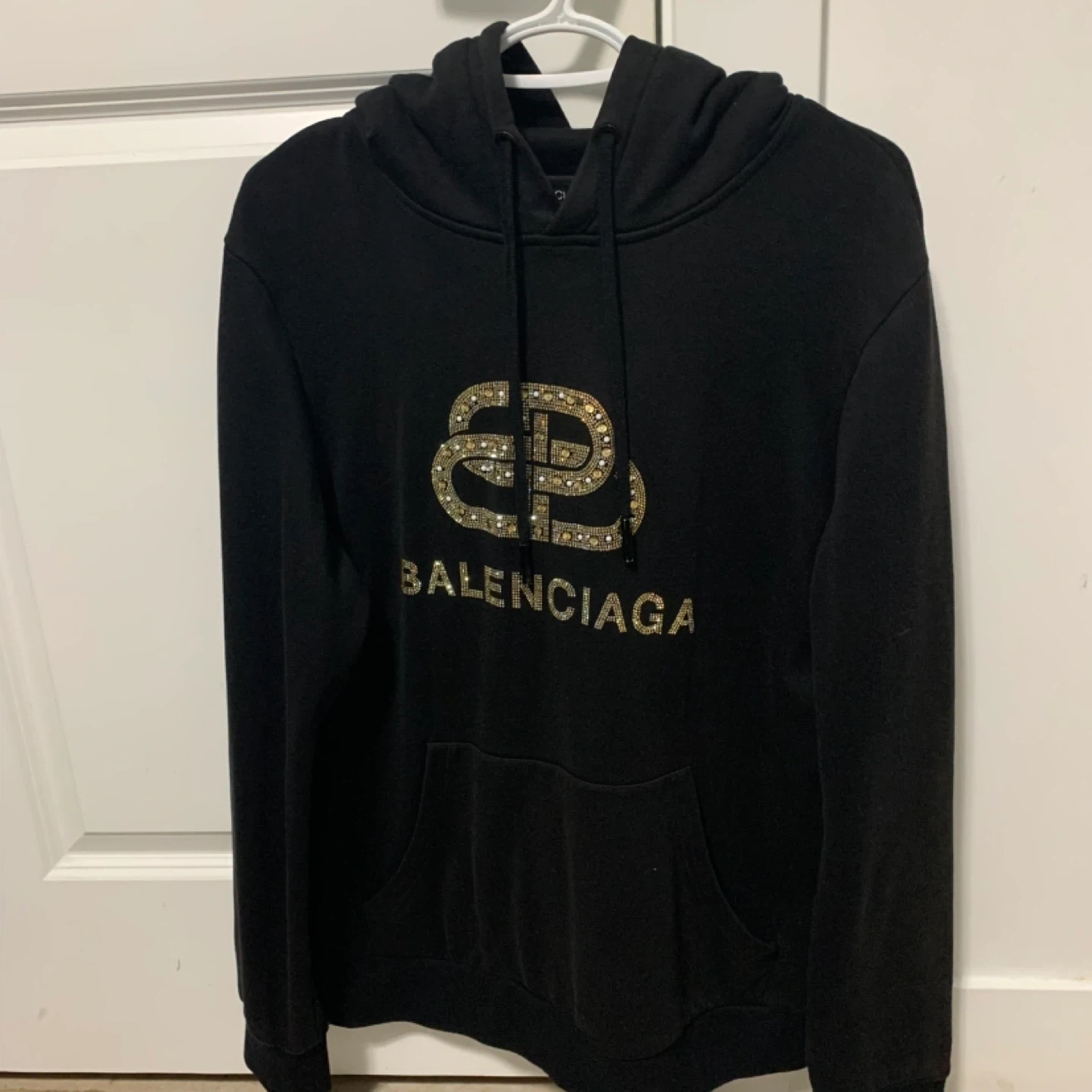 Selling a black Balenciaga hoodie. It features a large BB logo in gold on the front. It's in great condition and ready for a new owner!