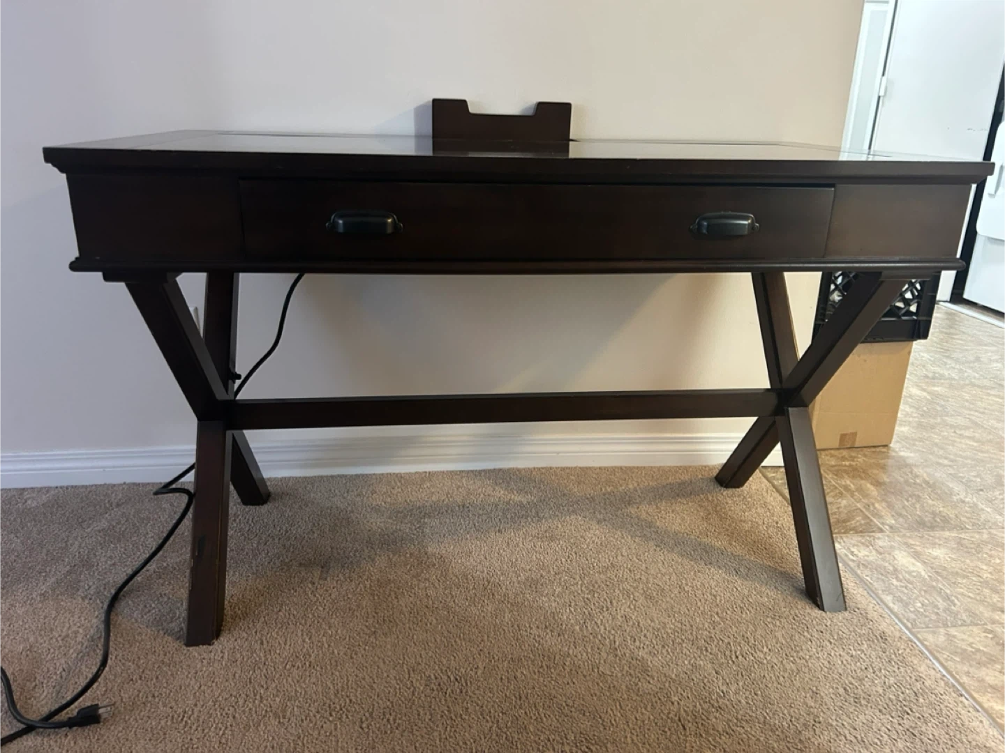 Selling a dark brown wood desk that features a sleek glass top. It has a unique X-shaped leg design and a handy drawer for storage. It's in good condition (with minor scuffs as shown) and would be a great addition to any home office or study space!