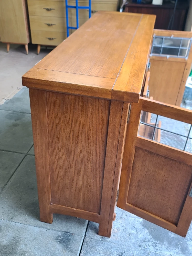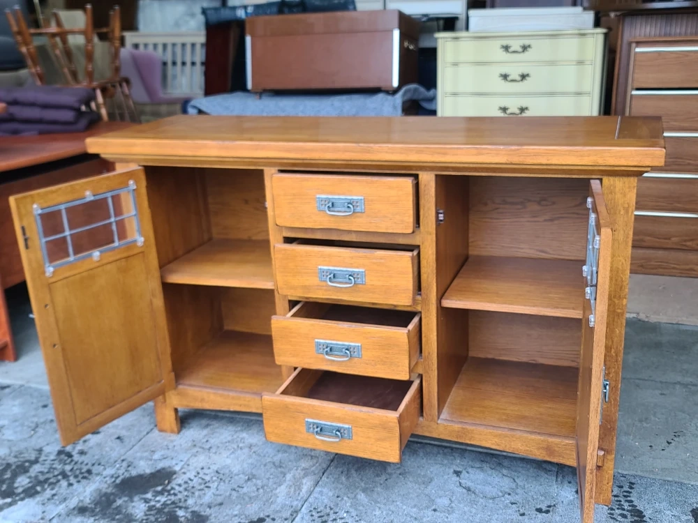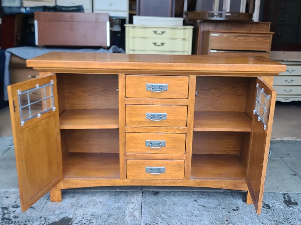 A lovely wooden cabinet, perfect for adding some extra storage to your home! It features four drawers in the center and shelving behind glass-paneled doors on either side. It's in great condition and ready for a new home. Measurements: W 57" × D 18" × H 36". Delivery can be arranged. Viewing and pickup by appointment.
