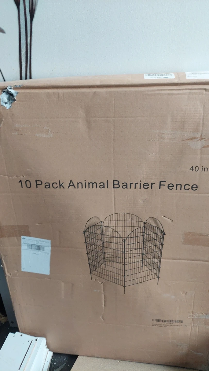 Selling a 10 pack of decorative metal garden fence panels. They're 40 inches tall and are perfect for a garden, patio, or flower bed. The fence is waterproof and rustproof, with strong solder joints and a smooth surface