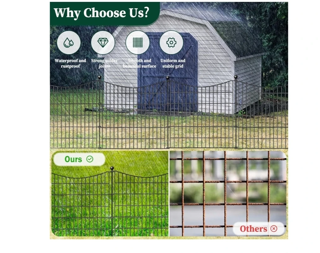 Selling a 10 pack of decorative metal garden fence panels. They're 40 inches tall and are perfect for a garden, patio, or flower bed. The fence is waterproof and rustproof, with strong solder joints and a smooth surface