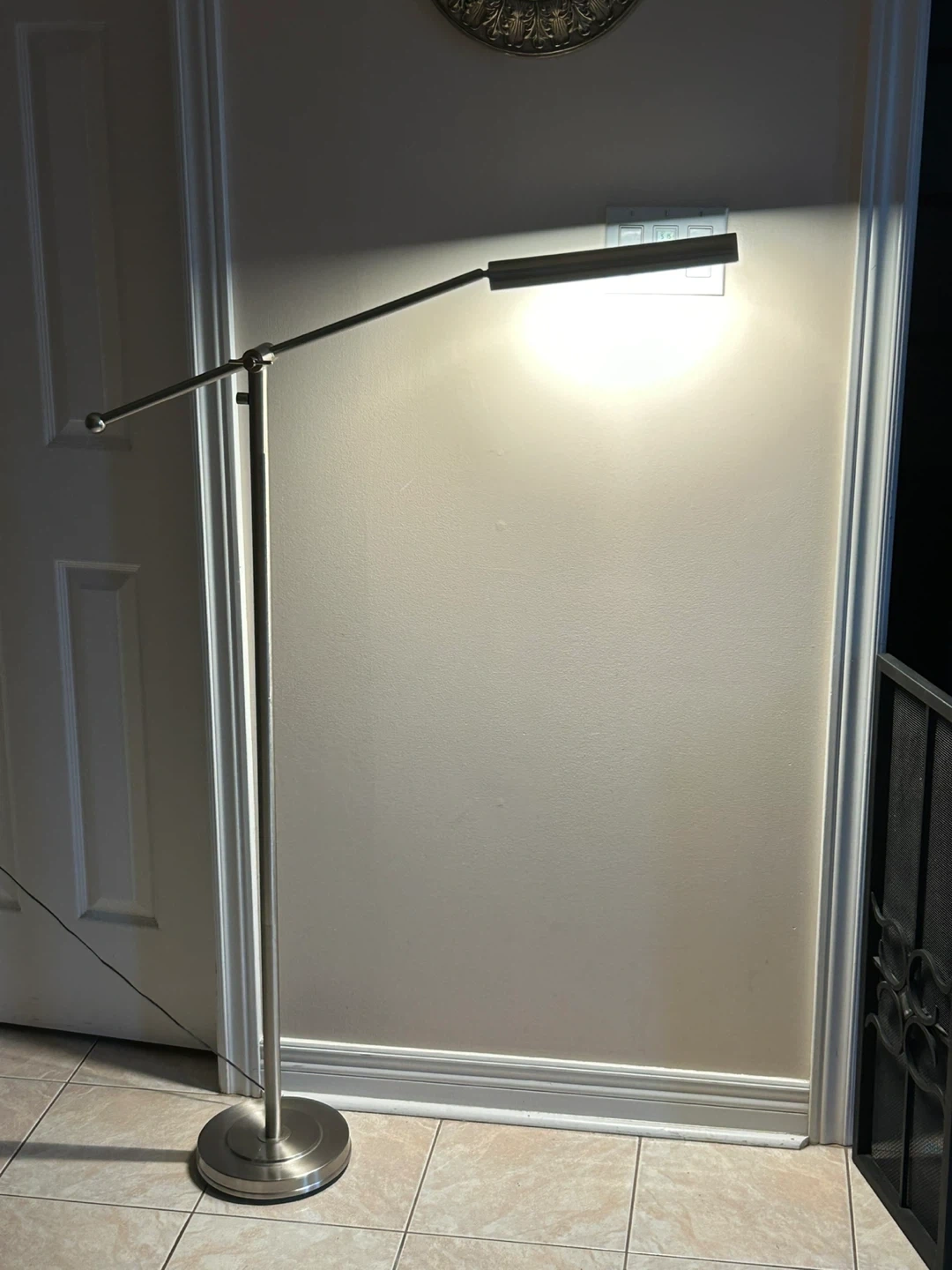 Selling a sleek silver floor lamp that would look great in any living space! It's in good condition and provides a nice, adjustable light source. It has a modern design with a round base and adjustable arm.