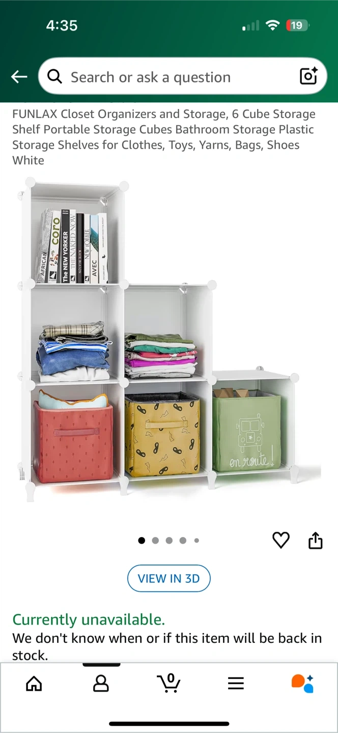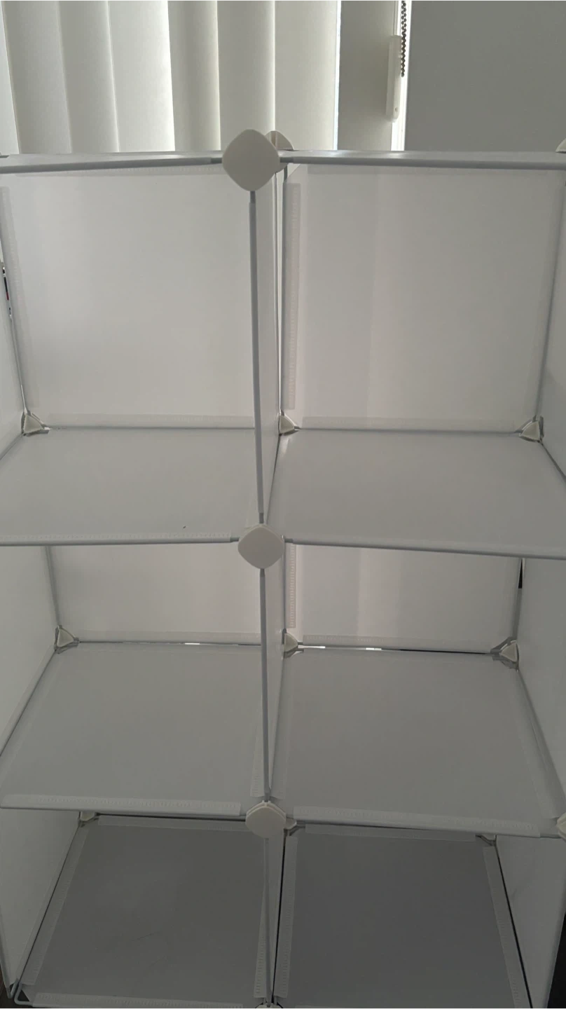 Here's a FUNLAX 6 cube storage shelf! It's great for organizing clothes, toys, yarns, bags, and shoes. The shelves are made of plastic and are white in colour. Perfect for a bathroom or closet!