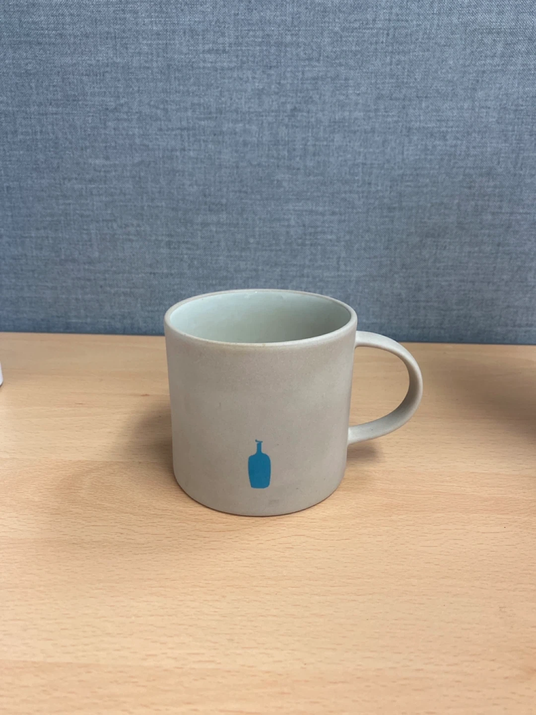 Selling a Blue Bottle Coffee mug in a neutral grey color. It's perfect for enjoying your morning coffee or tea! The simple design with the blue bottle logo adds a touch of modern style to your drinkware collection.