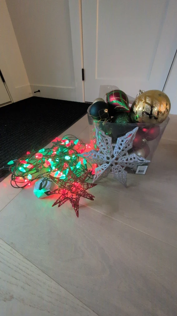 Selling a set of Christmas ornaments and lights! Includes a variety of colours and styles of ornaments, plus a string of multi-coloured lights. Perfect for getting into the holiday spirit