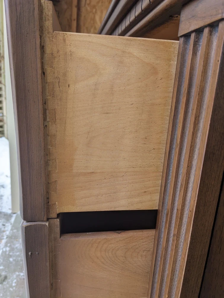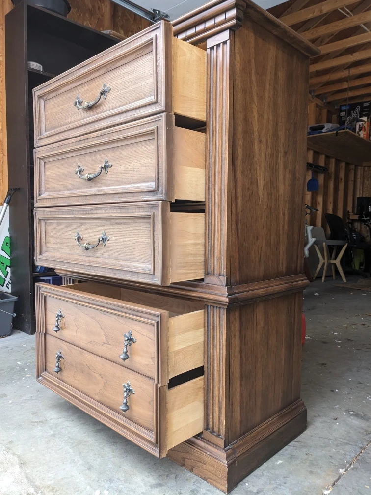 This 5 drawer solid wood tallboy features spacious dovetailed drawers that all open and close smoothly and are in good condition inside.
