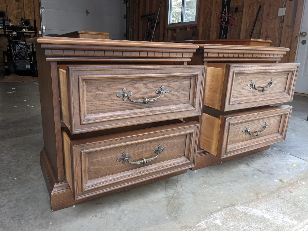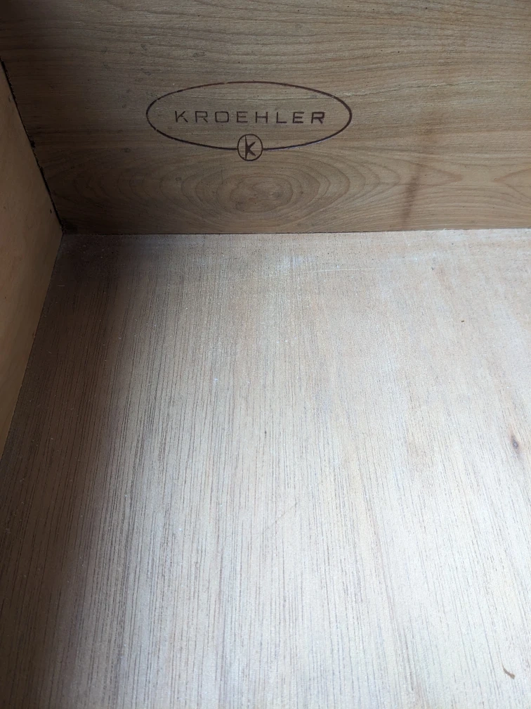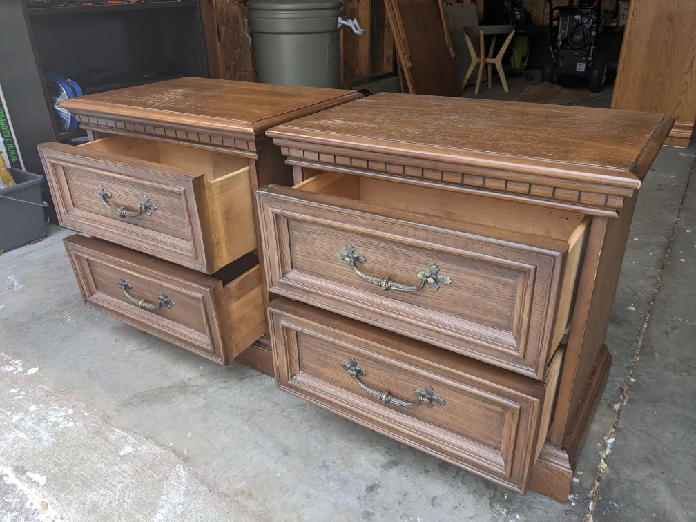 These solid wood matching nightstands by quality craftsmen, Kroehler, feature two spacious drawers with dovetail joint construction, that all open and close smoothly on their guides. The drawer interiors are all in excellent condition.