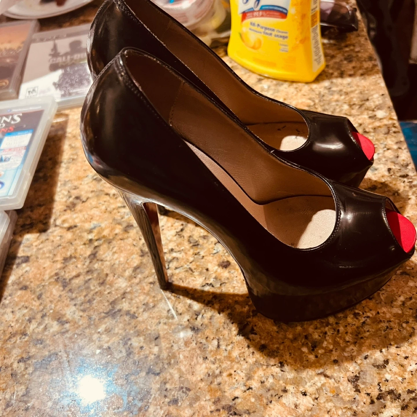 Selling a pair of Christian Louboutin heels. They are black with a red sole and open toe. They are in good condition!