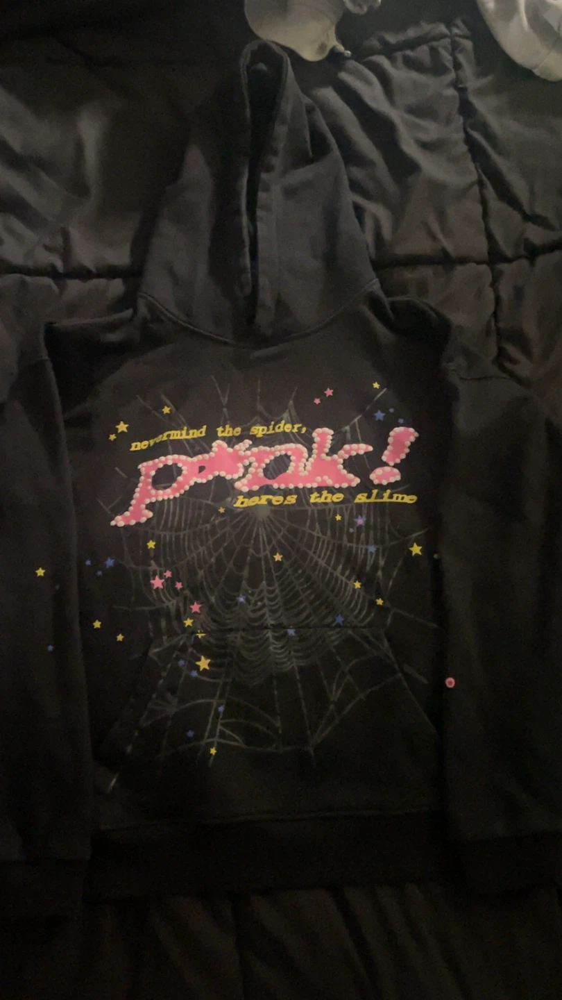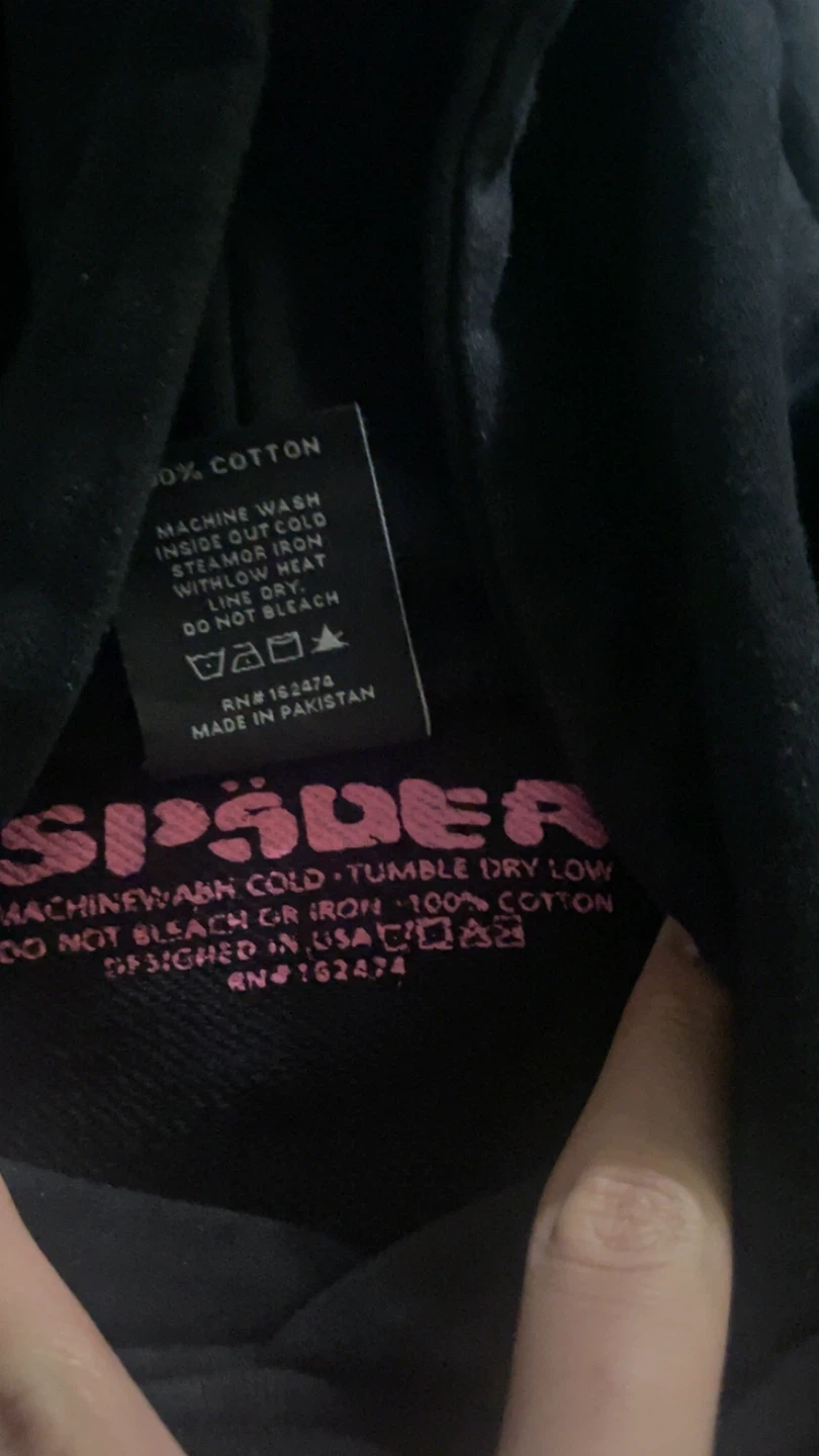 Selling a SP5DER hoodie in size small. The hoodie is black with pink and yellow accents. The material is 100% cotton. Machine wash cold and tumble dry low