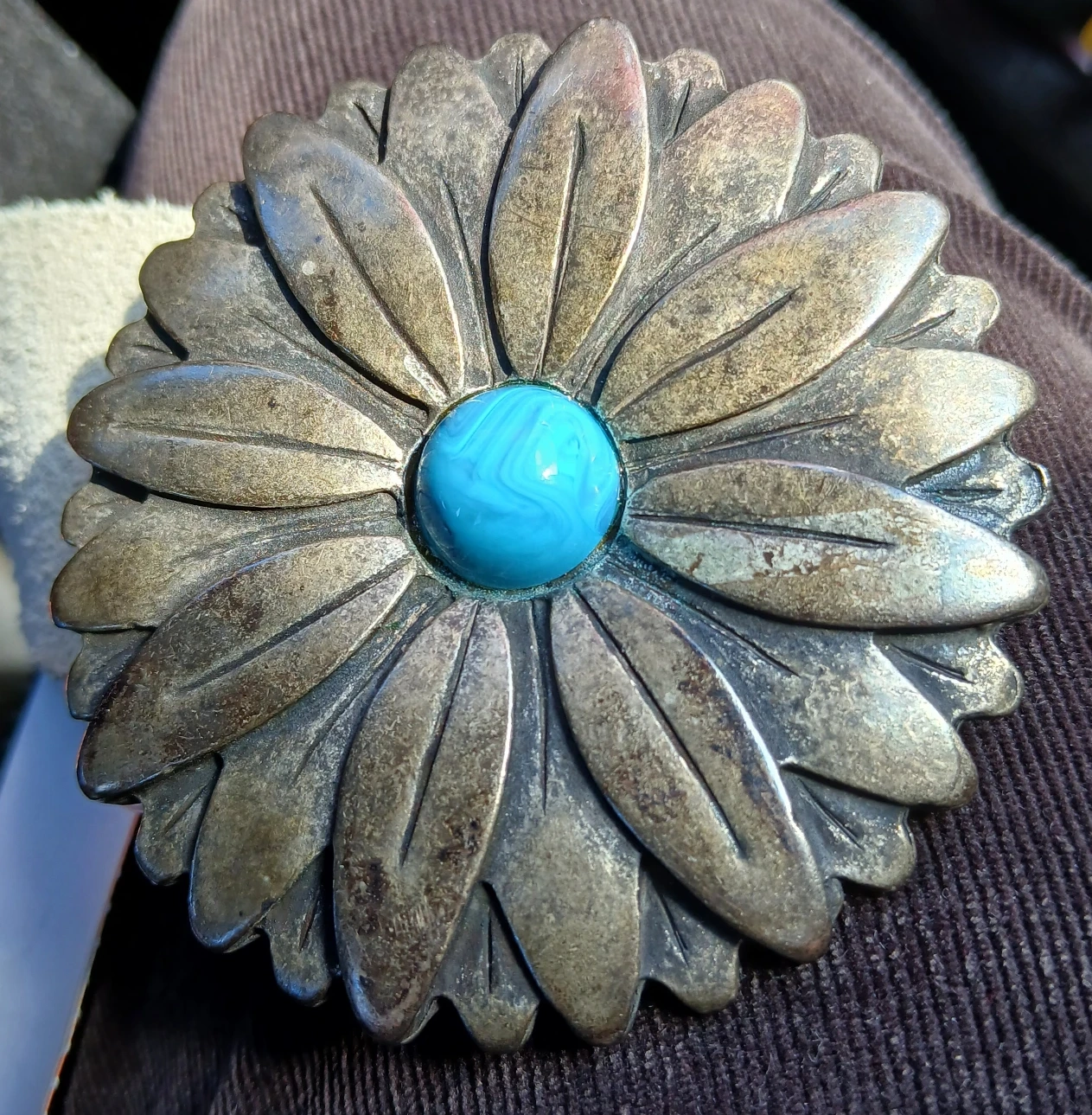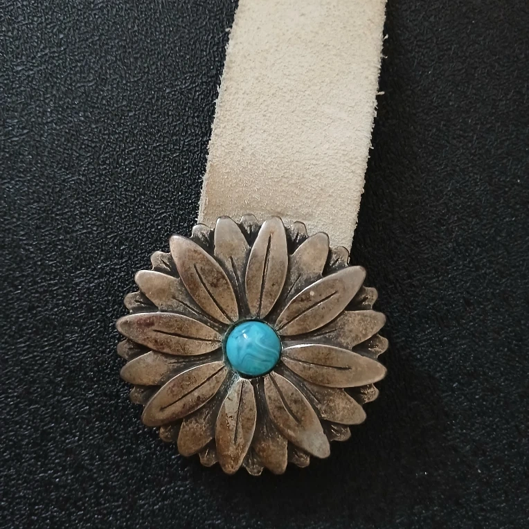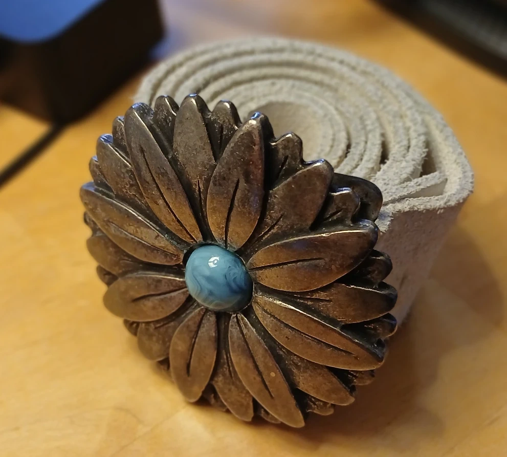 Selling a unique Buffalo brand belt! It features a beautiful floral buckle with a turquoise-coloured center. The belt itself is made of leather and has a pattern of small holes throughout. Perfect to add a bit of flair to any outfit!