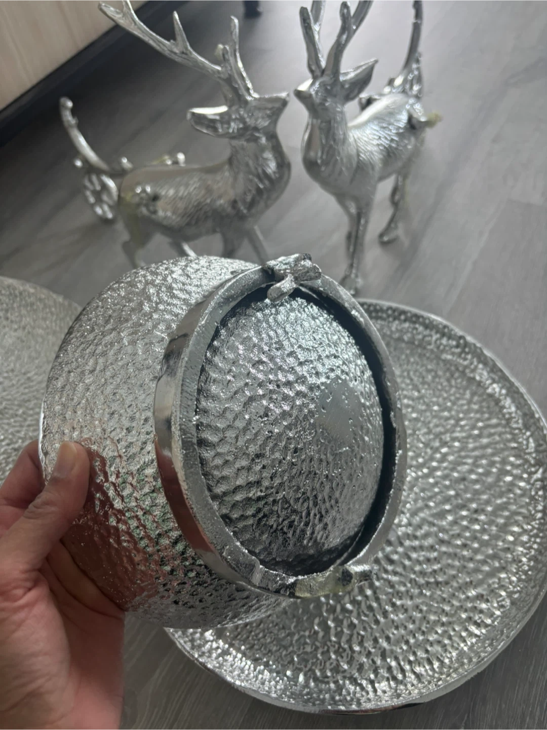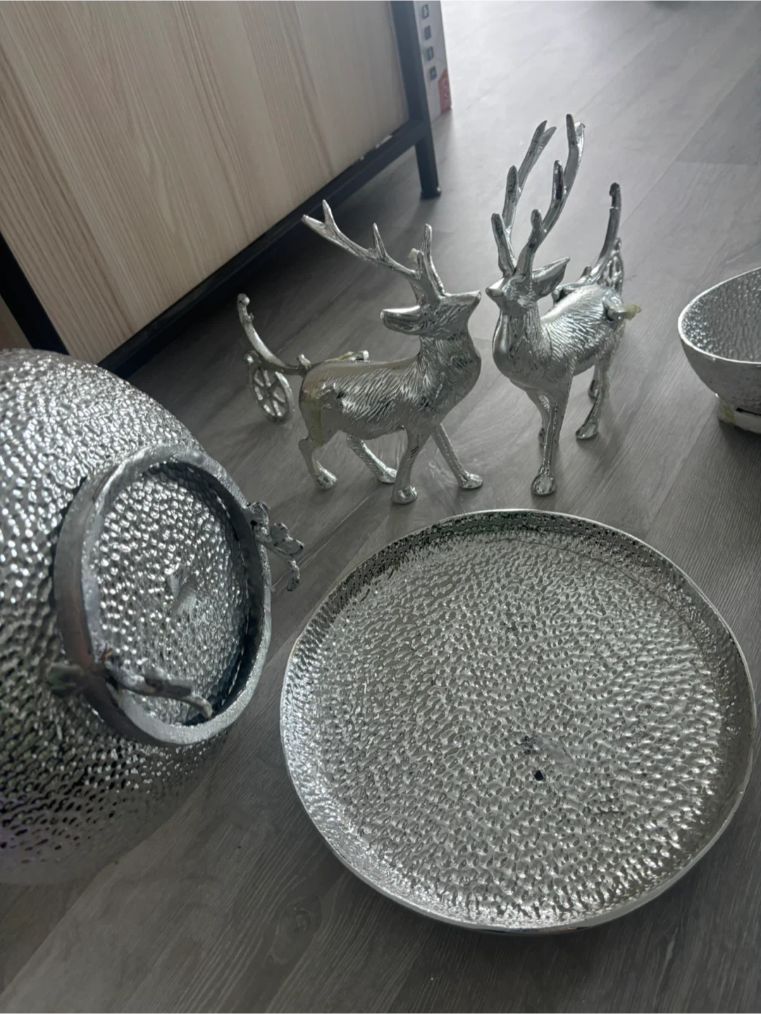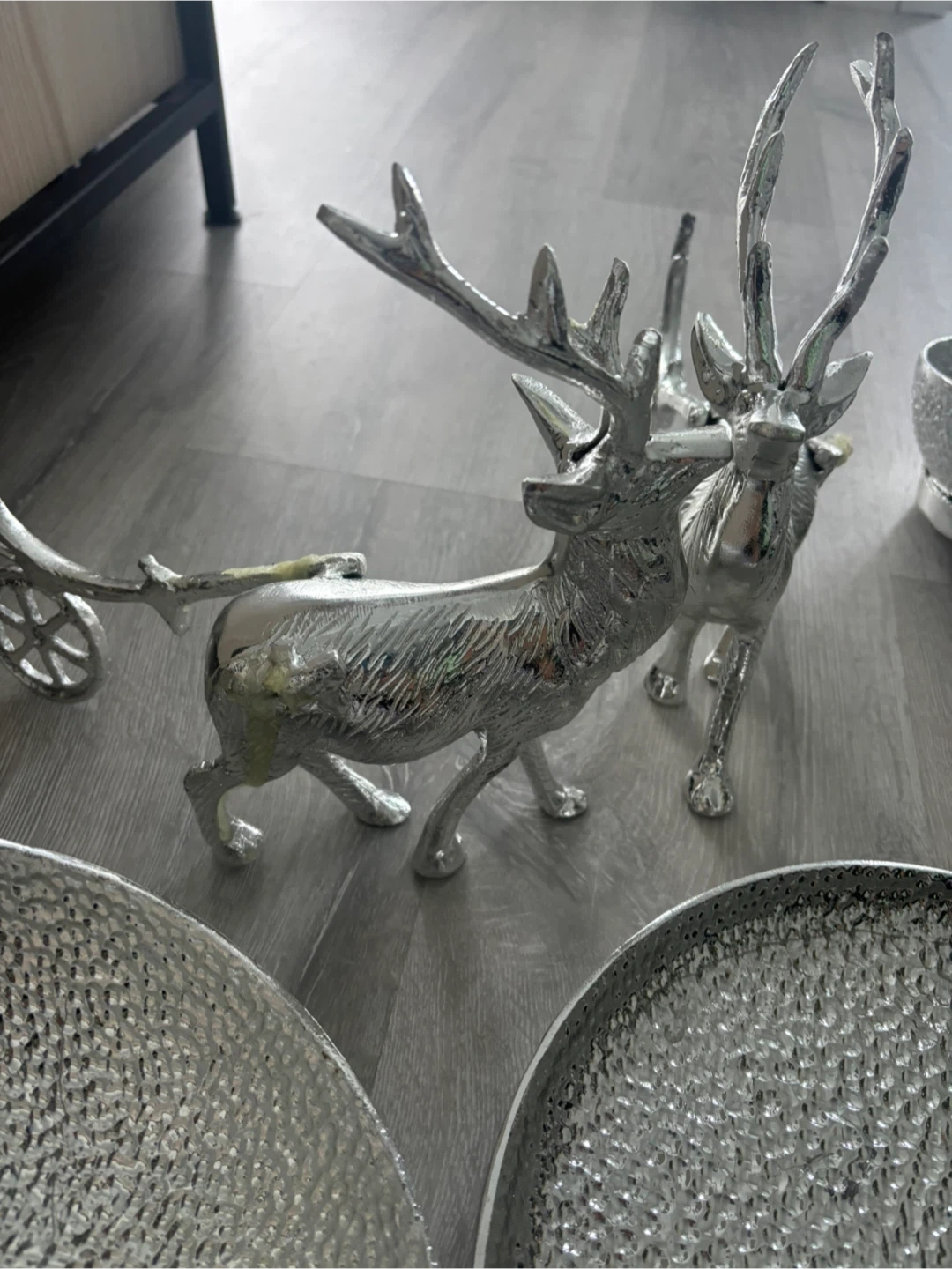 Selling a set of silver-coloured reindeer figurines and serving dishes.