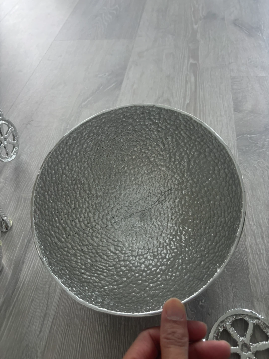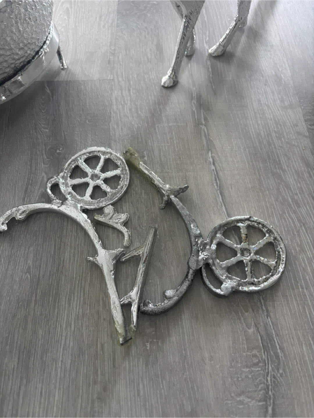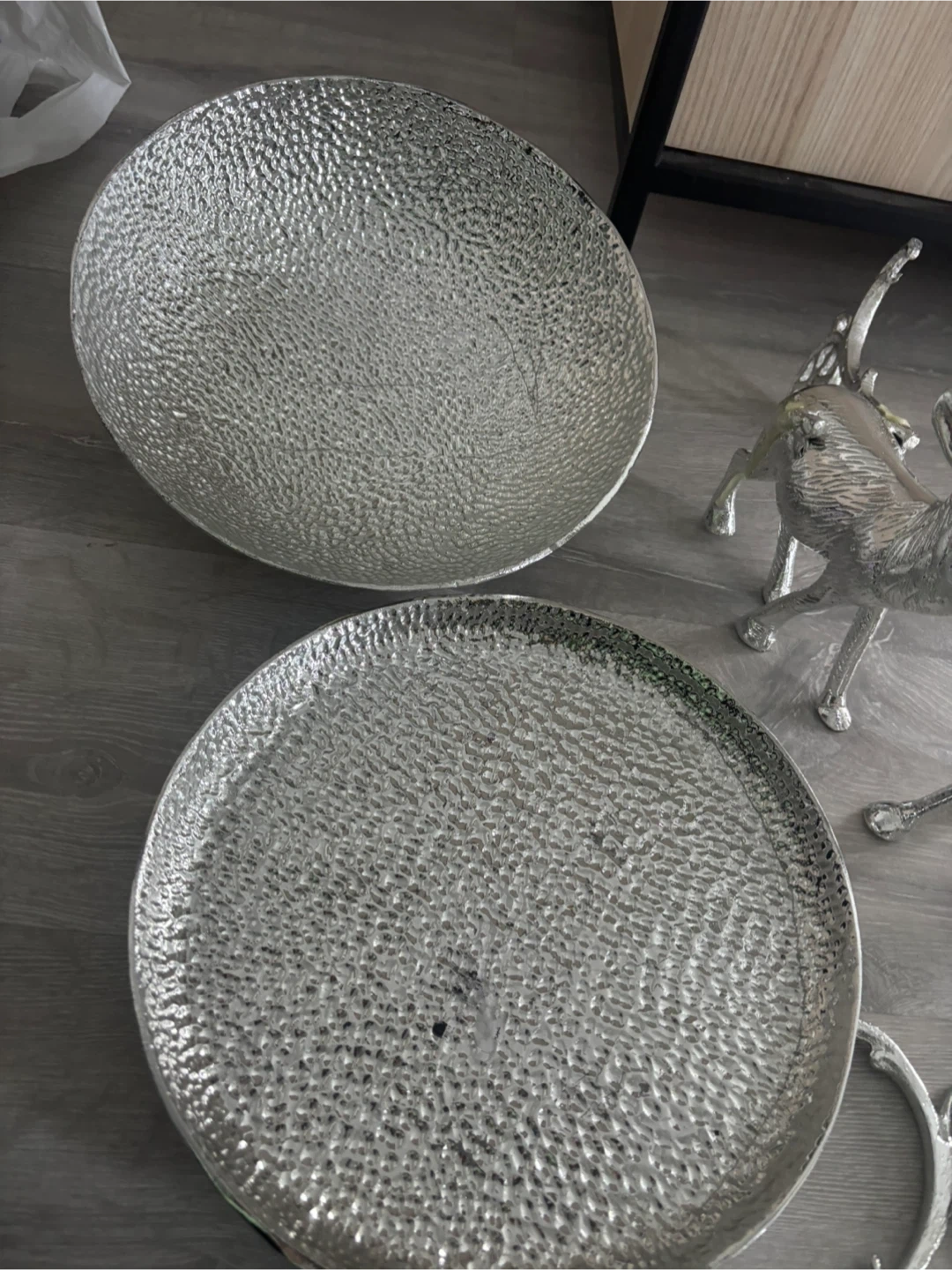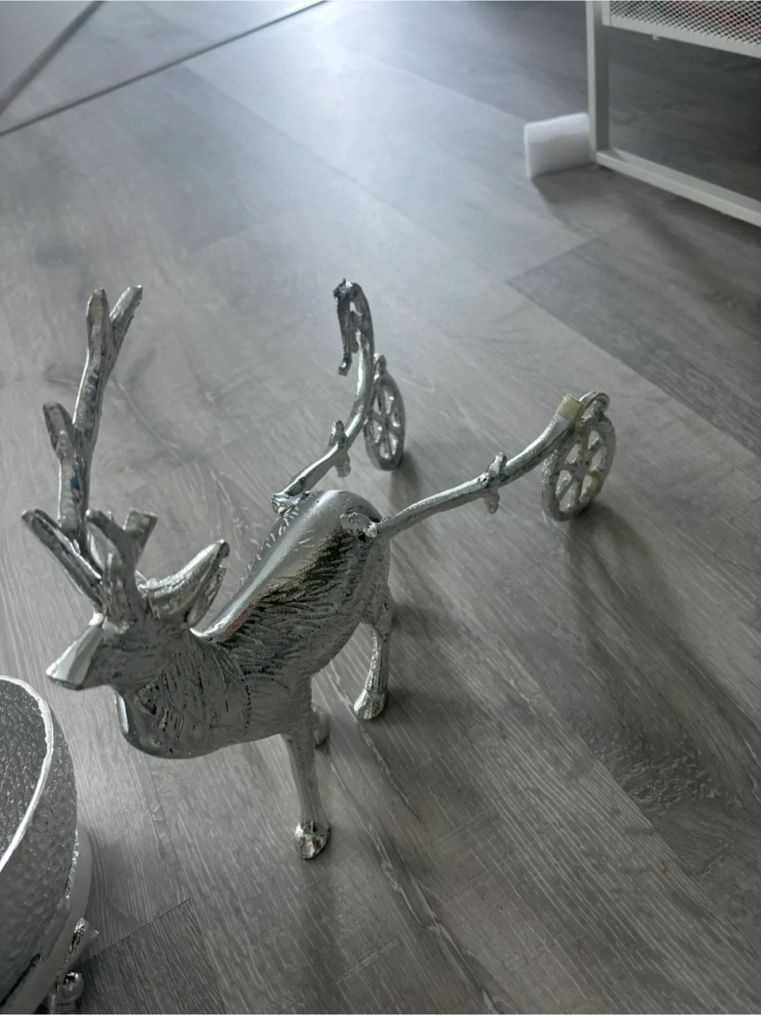 Selling a set of silver-coloured reindeer figurines and serving dishes.