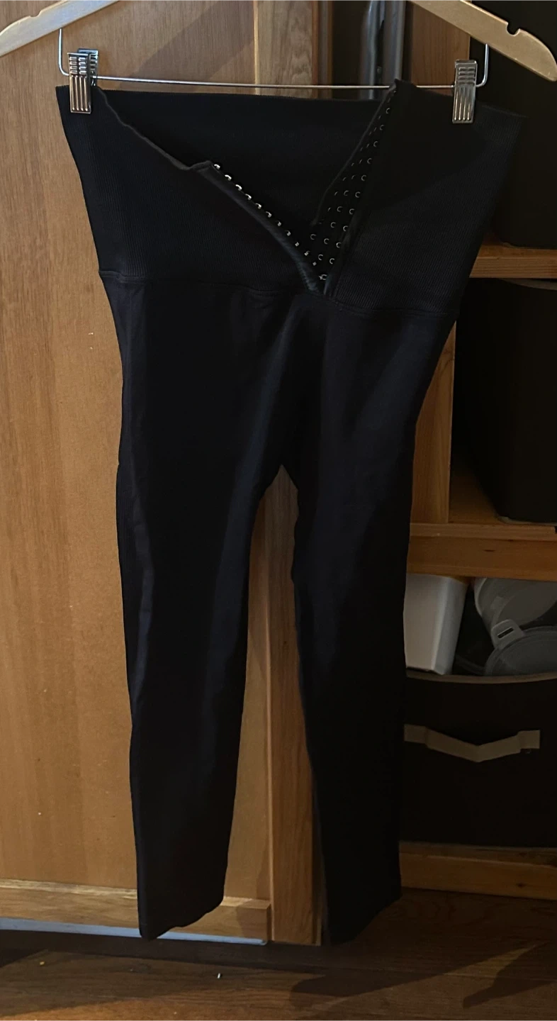 Selling a pair of black women’s waist trainer corset leggings. They appear to be in good condition and have a unique design with hook-and-eye closures at the waist. Perfect for workouts or everyday wear!