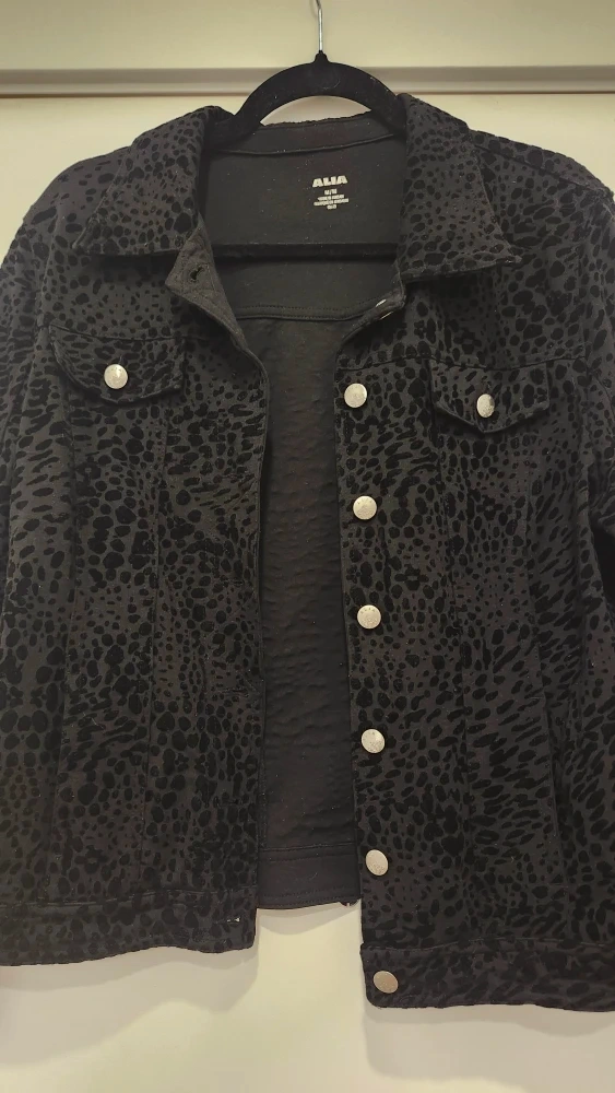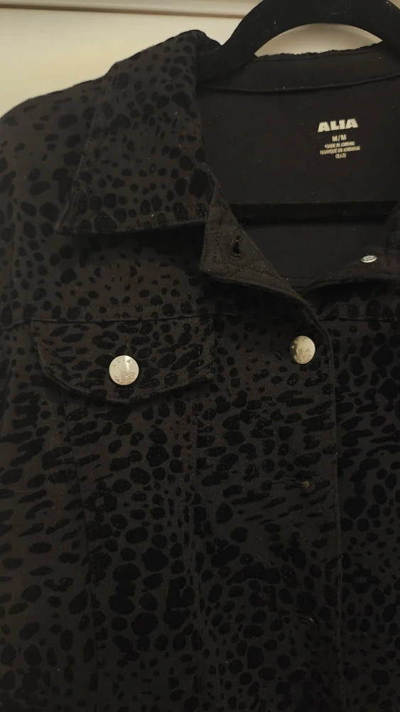 This is an ALIA black jacket with a cool leopard print pattern! It's a size M. The material is soft and comfortable, perfect for adding a bit of flair to any outfit