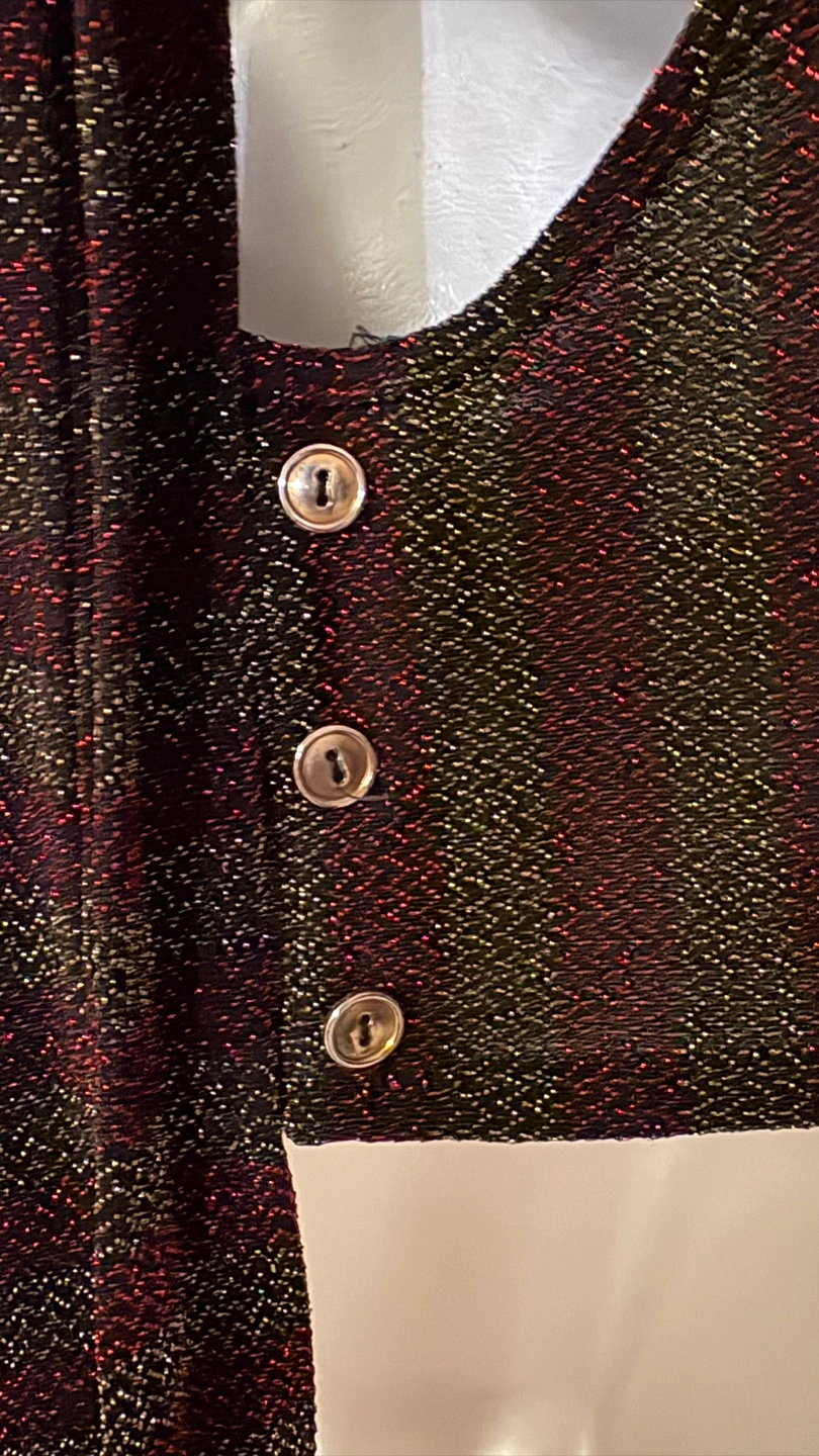 The back features a keyhole opening and a tie closure at the neck, plus a button closure at the waist.