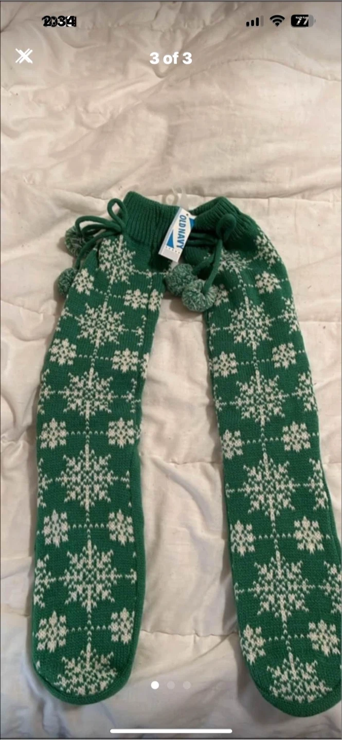 Cozy up with these adorable Old Navy slipper socks! They're a festive green with a white snowflake pattern and cute pom-poms. Size large and feature non-slip grips on the soles. Originally bought for $17.50