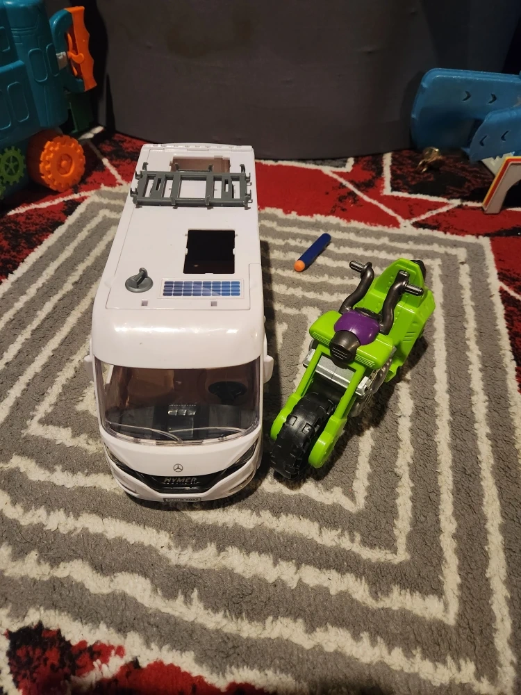 Selling a Mercedes HYMER toy RV camper and a green motorcycle toy. The RV camper is white and appears to be in good condition. The motorcycle is green with black wheels and a purple seat. Perfect for kids who love vehicles!