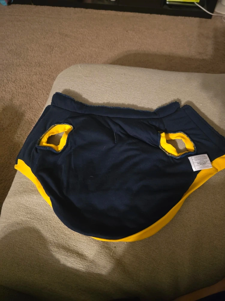 Selling a Bailey & Bella pet coat in size M/M. It's a stylish and cozy coat for your furry friend! The coat is made of polyester and cotton, perfect for keeping your pet warm. It features a navy blue and yellow colour scheme with a quilted design on the bottom half. Your pet will look adorable in this! For small dogs, has never been used, was way to small for my puppy.