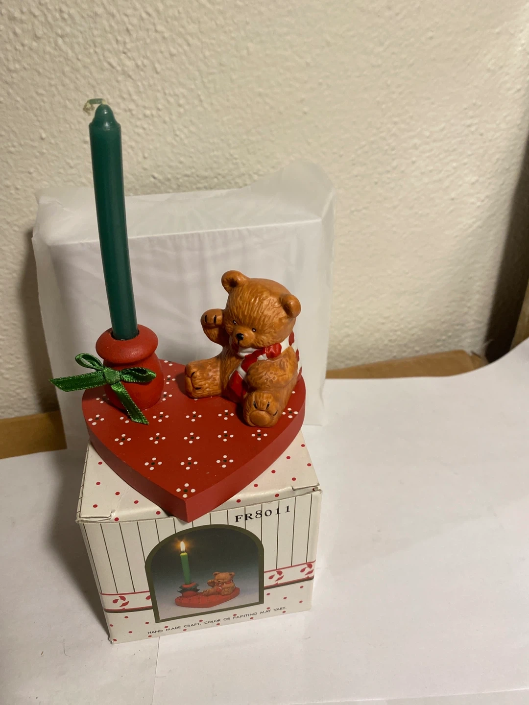 A super cute candle holder featuring a teddy bear on a red heart base! It comes with a green candle and the original box. The box has the code FR8011 on it. Perfect for adding a touch of sweetness to any room! 4.5”T