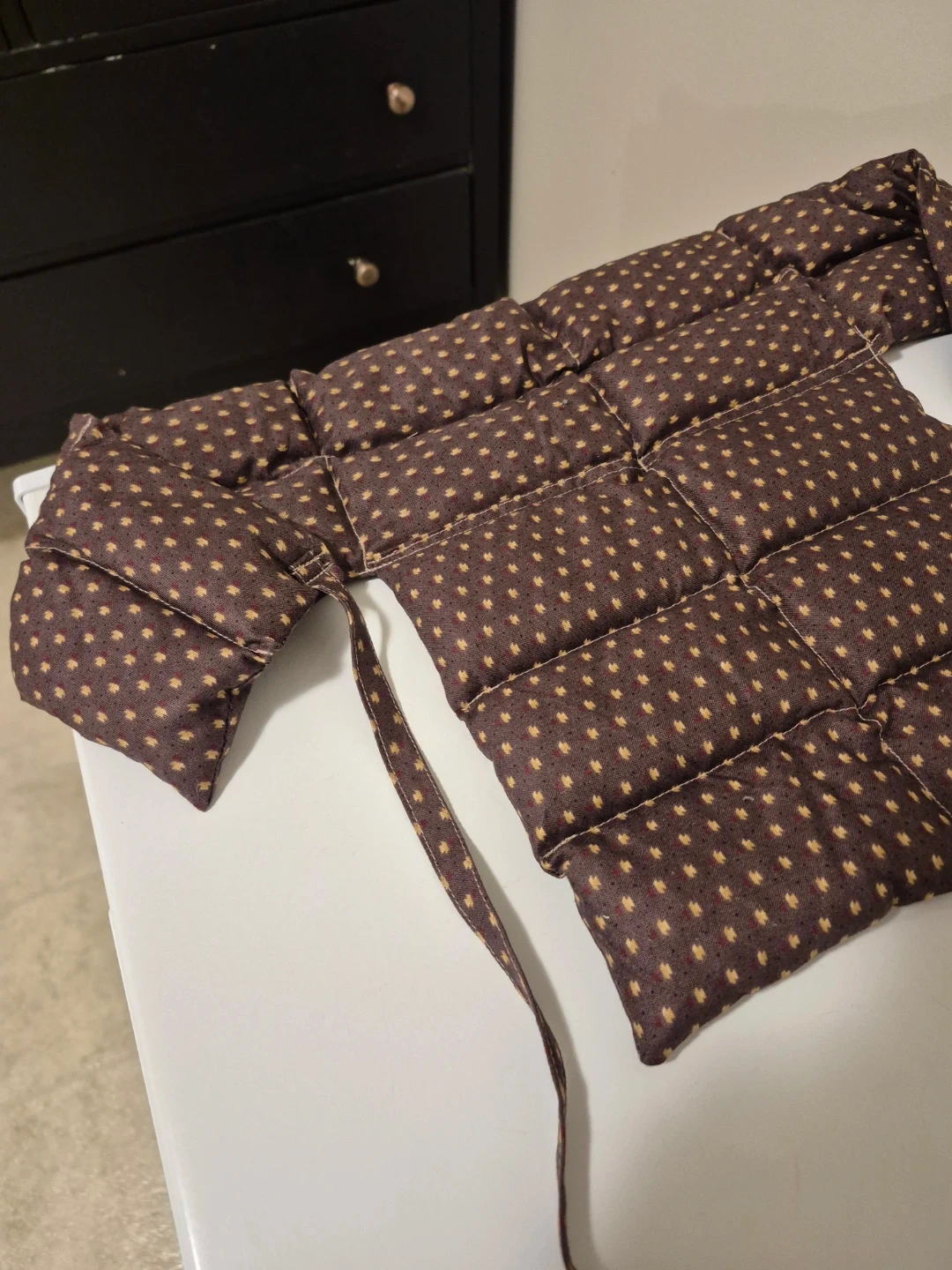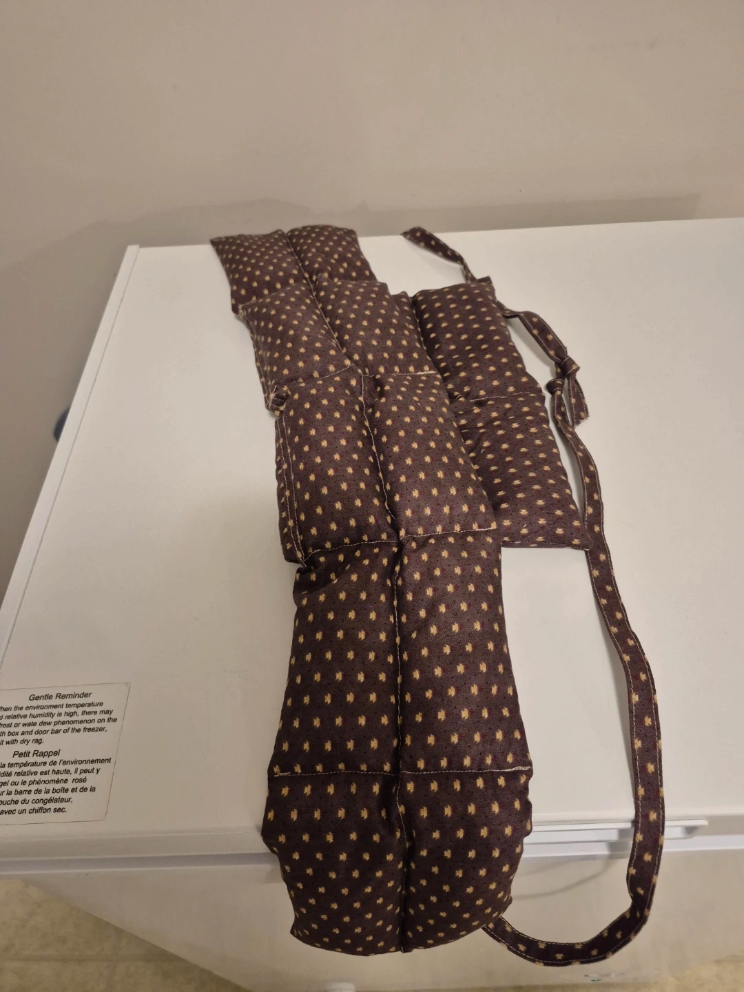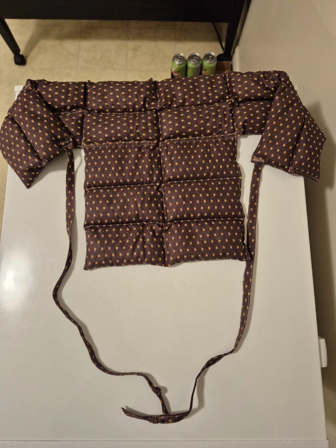 This is a microwave able beanbag pillow in brown & gold. It's in great condition and ready to help you relax your neck, shoulders & upper back and possibly around your lower waist, too!!! πββοΈπββοΈ