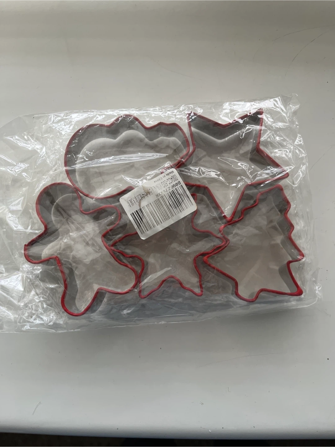 I have a set of Christmas cookie cutters still sealed in their original packaging! They feature a red trim and various shapes like a gingerbread man, star, Christmas tree, snowflake, and snowman.