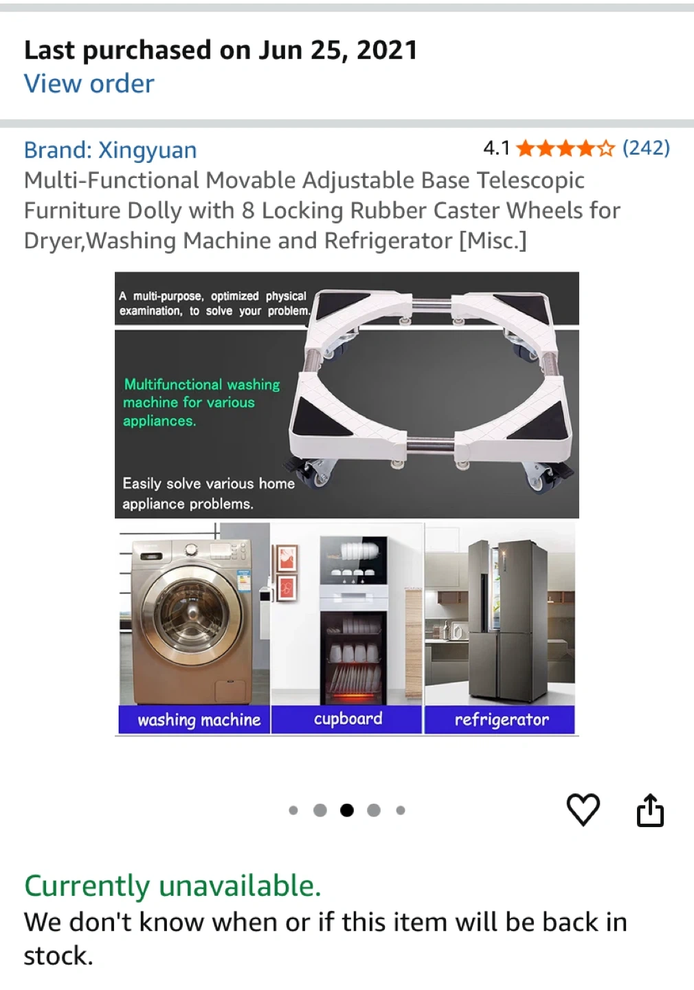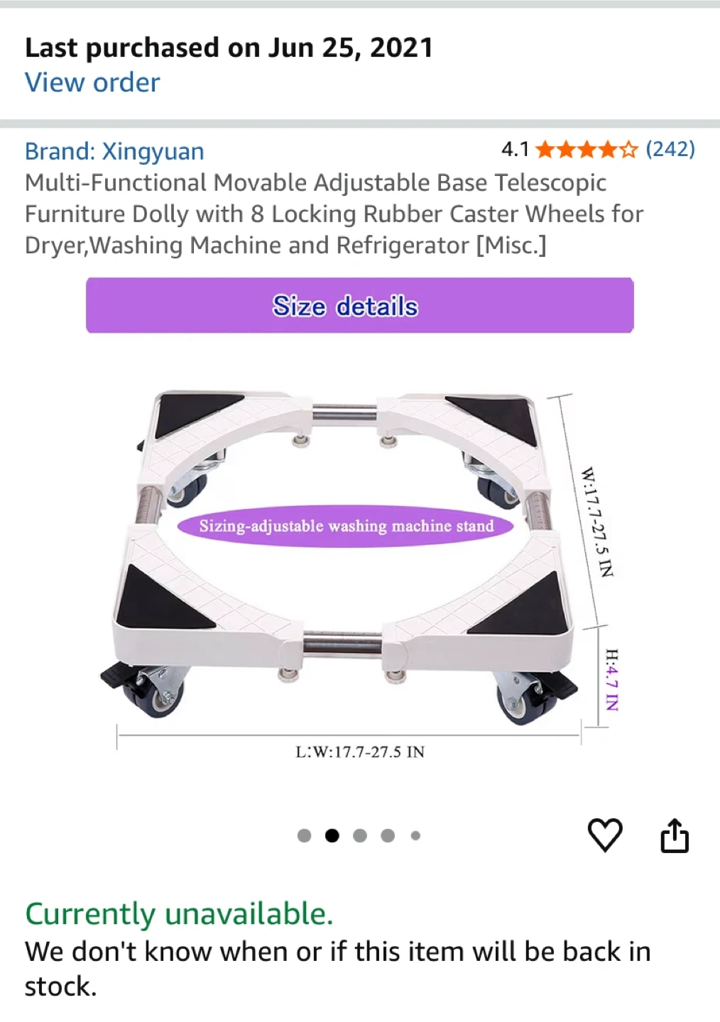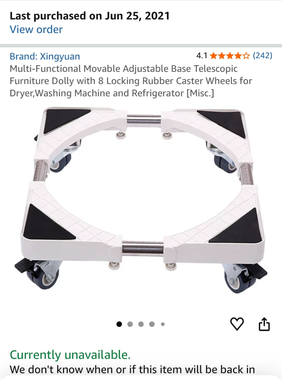 Selling a Xingyuan multi-functional movable adjustable base telescopic furniture dolly. It has 8 locking rubber caster wheels for a dryer, washing machine, and refrigerator. It's easy to install and move with shock reduction.