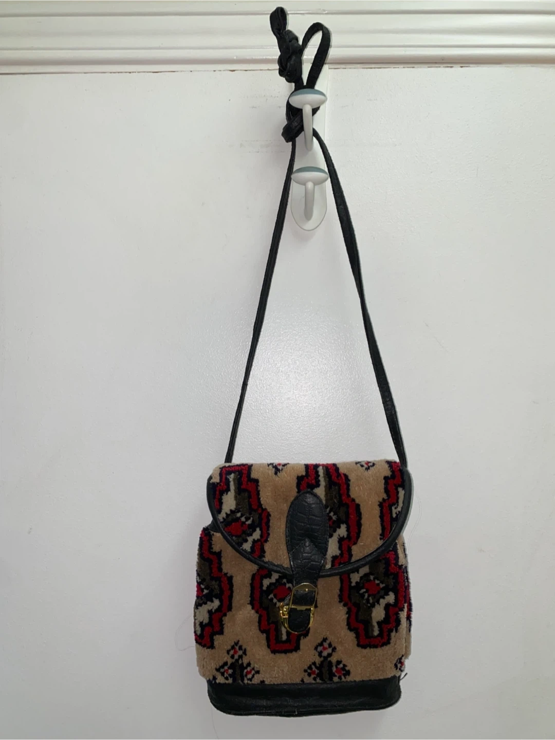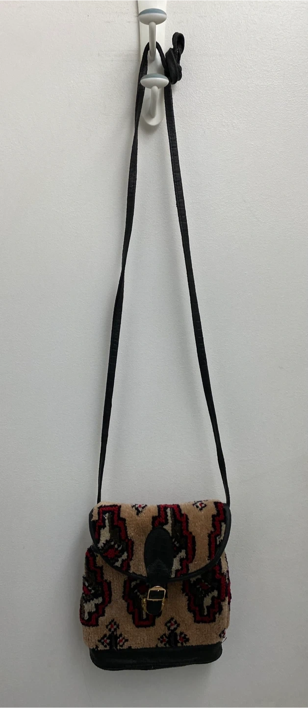 Cute shoulder bag with a unique patterned design! It features a black strap and a flap closure with a gold buckle.