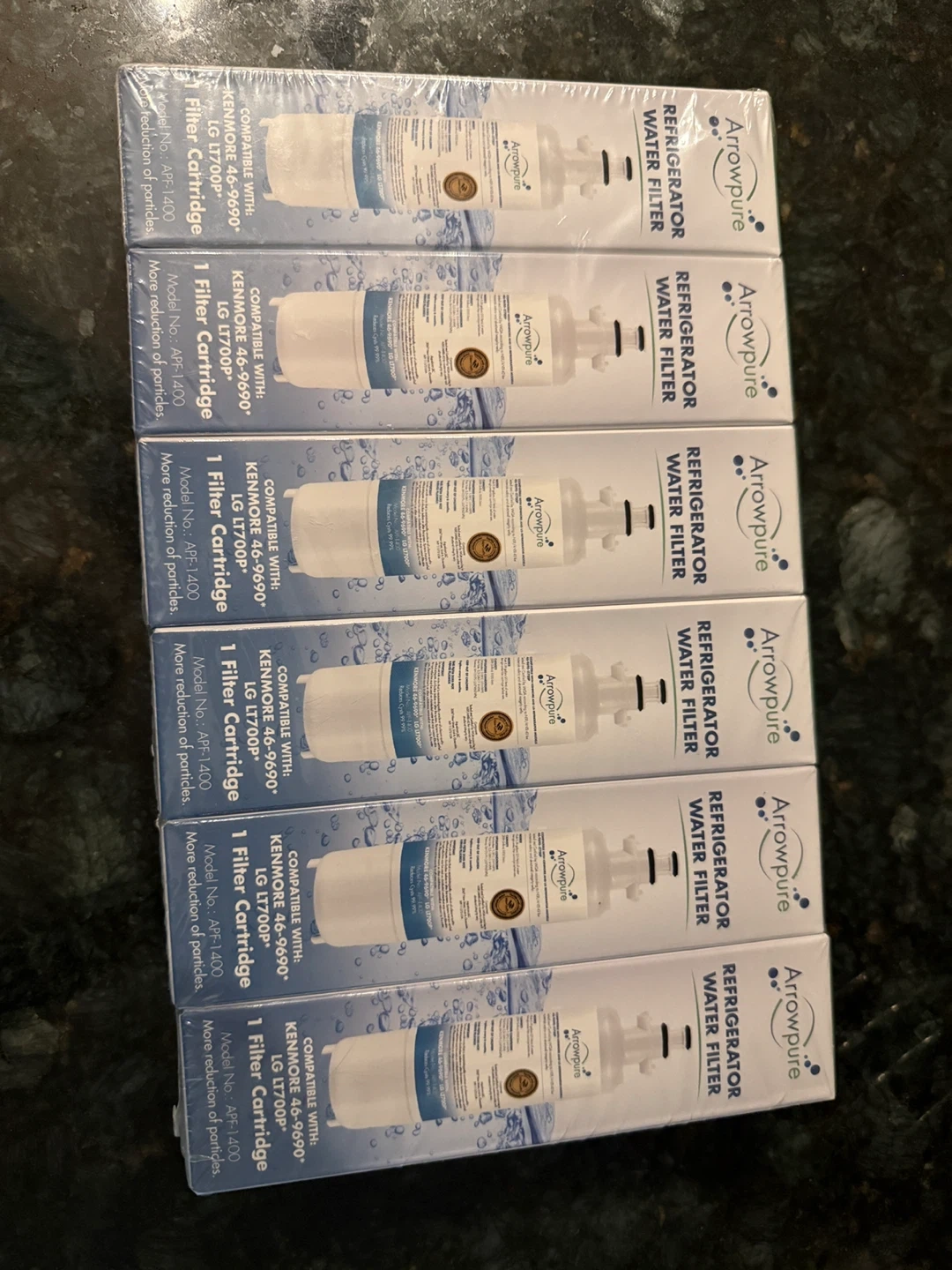 Selling a pack of six Arrowpure refrigerator water filters, model APF-1400. These are compatible with Kenmore 46-9690, LG LT700P, and LG LT700P refrigerators. They are new and still in their original packaging. These filters provide more reduction of particles for cleaner water!