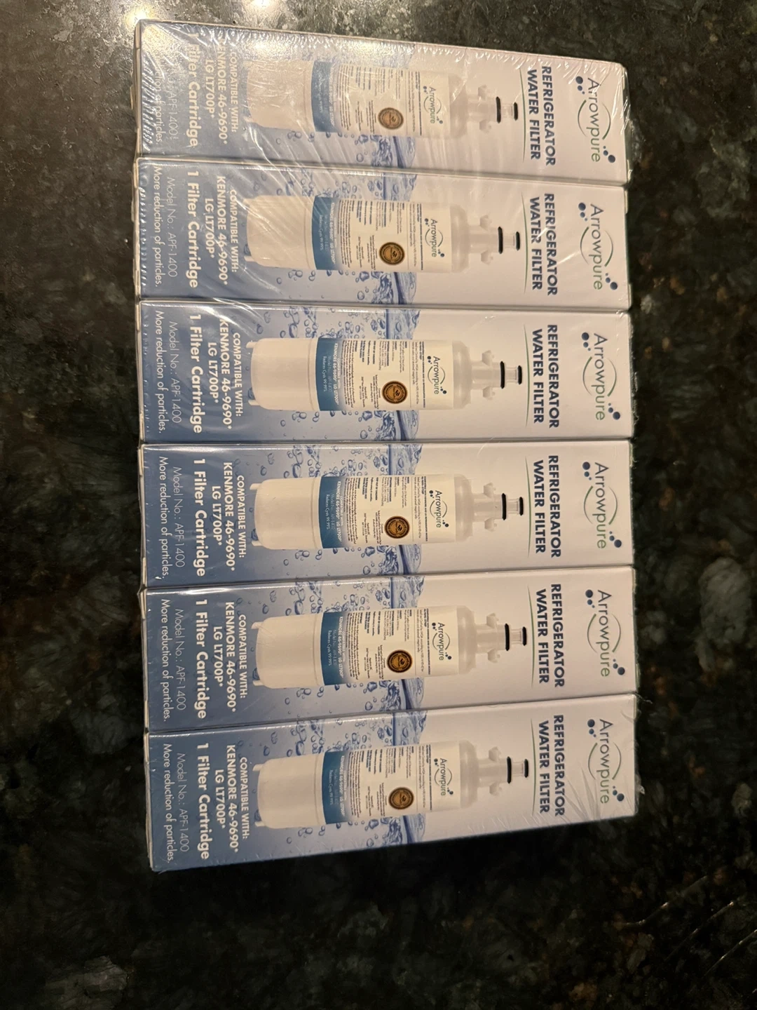 Selling a pack of six Arrowpure refrigerator water filters, model APF-1400. These are compatible with Kenmore 46-9690, LG LT700P, and LG LT700P refrigerators. They are new and still in their original packaging. These filters provide more reduction of particles for cleaner water!