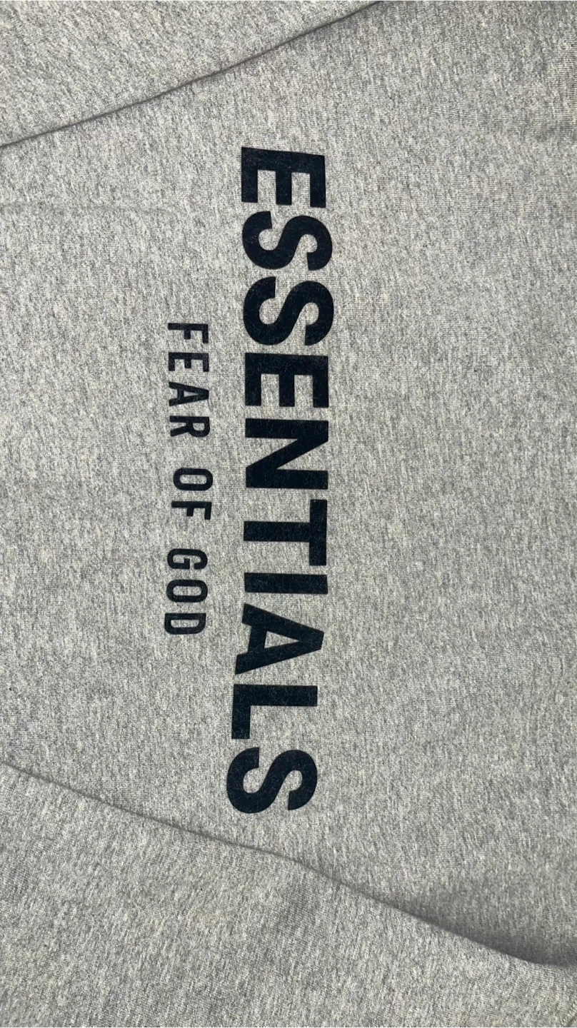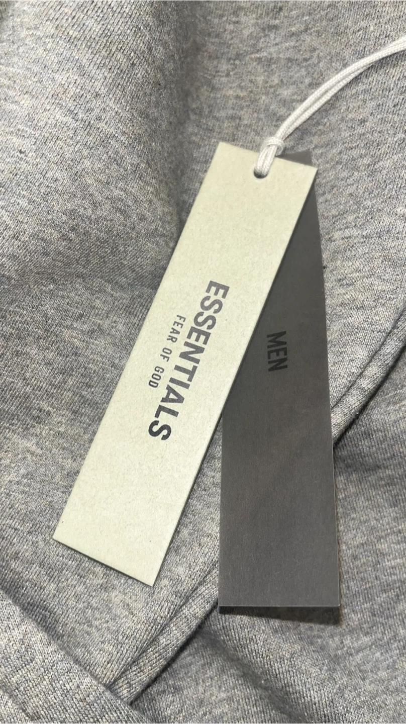 I'm selling an Essentials Fear of God hoodie in a dark oatmeal color. It's in new condition and ready for a new owner! It has the Essentials logo on the front and a tag attached.