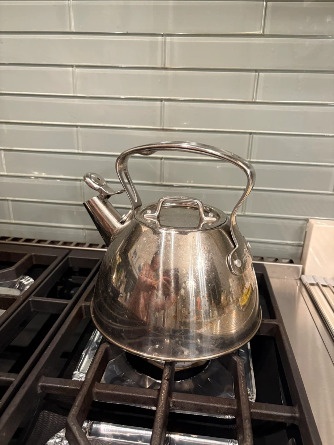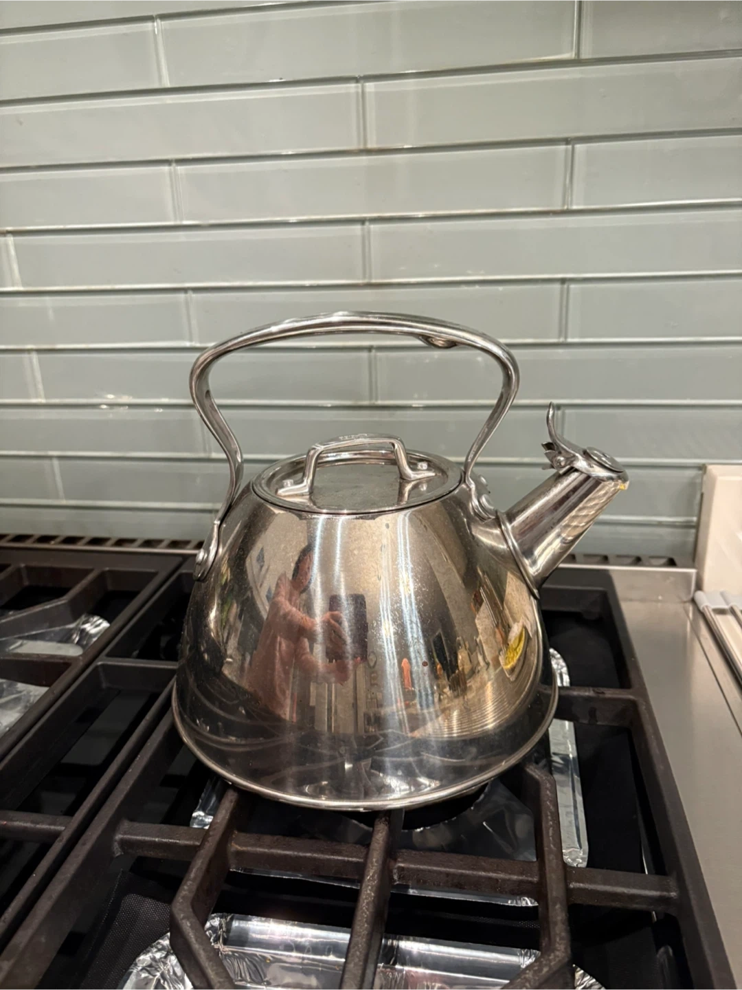 Selling an All-Clad stainless steel tea kettle. It's a 2-quart/1.9L kettle and is induction compatible. There are some signs of use.