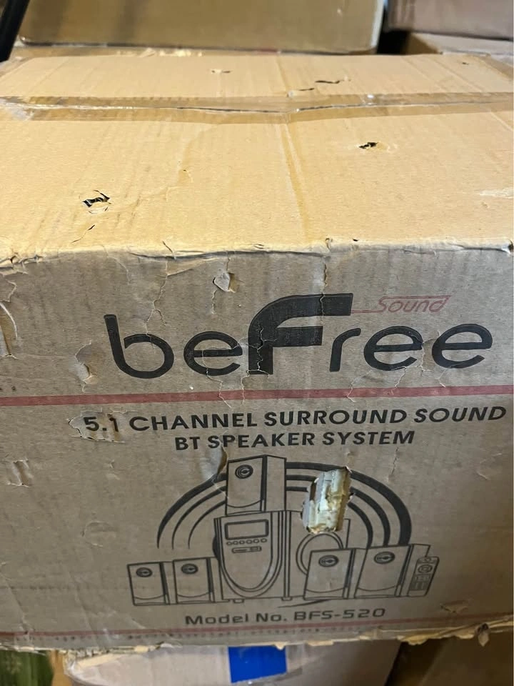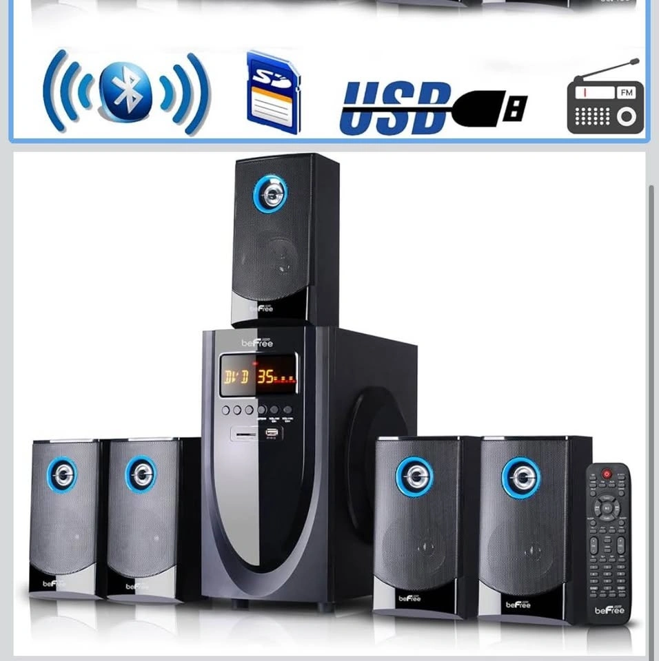 New open box beFree Sound 5.1 channel surround sound system with Bluetooth, USB, and FM. Box has some damage but the product inside is new and unused. Perfect for movies, gaming, music, or enhancing your living room audio experience! Features include a remote, deep bass subwoofer, and clear satellite speakers. Let me know if you're interested!