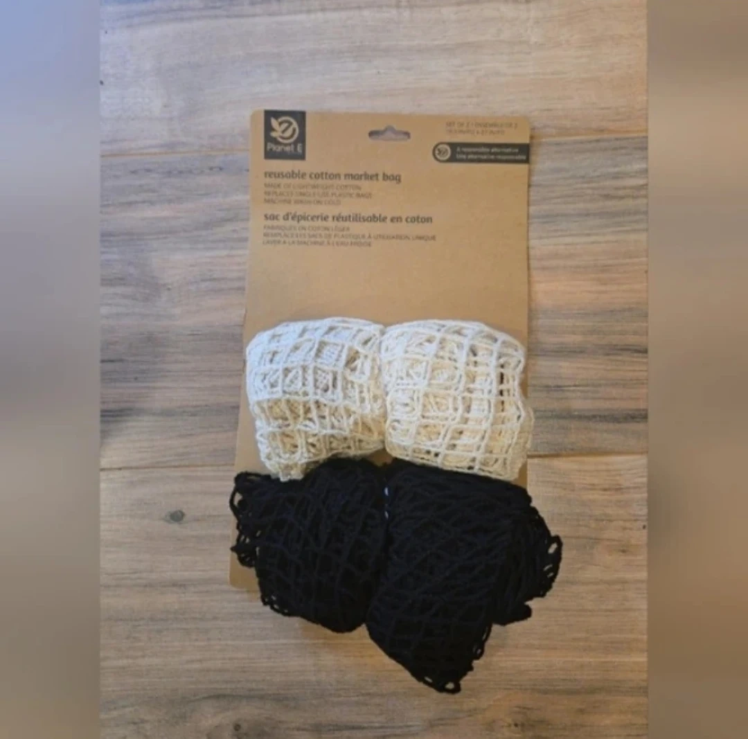 Selling a set of 2 Planet E reusable cotton market bags! One is cream and one is black. Great for groceries or any market trip! Brand new, still in package!