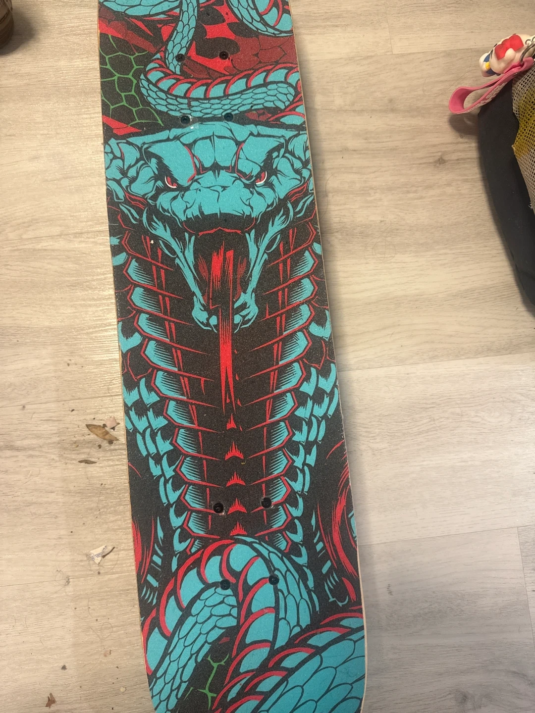 Selling a used skateboard with a cool snake graphic! The wheels are red and the deck has a blue and black snake design. Perfect for cruising around the neighbourhood or hitting up the skate park