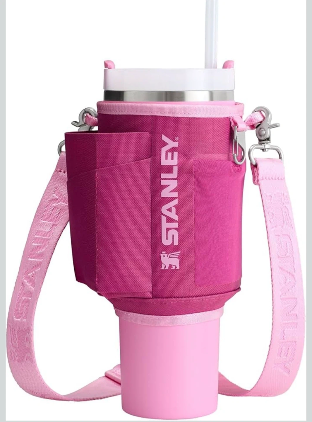 Here's a Stanley The All-Day Carry All, designed for the 40 oz Quencher! It's in fuchsia color and includes a cross-body carry strap. The size is 40 ounces. Comes with the original box