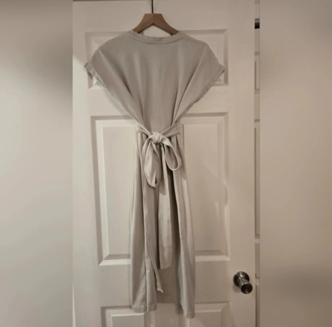 Selling a cute Zara dress in beige! It's a size small and in great condition. Perfect for a casual day out or dress it up for the evening. It has a tie detail at the waist, and a slit at the side.