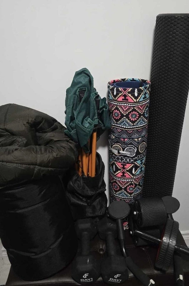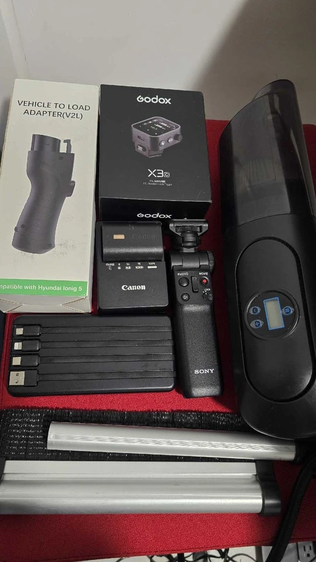 Moving Sale by Dec 9 - Make best offer: - Camera accessories (Godox flash trigger, Canon battery, charger & Sony mini tripod) - Car accessories (Hyundai Ioniq 5 EV V2L adapter, tire pressure, vacuum & cleaner) - Apple magsafe charger & USB C for Macs - Fitness Items (2 × 15lbs dumbbells, foam & ab rollers, yoga mat, raquets, balls, nets, etc) - Camping (sleeping bag & foldable chair) - Books (Lots on top of what you see in photo) Selling for cheap as moving Dec 10 & what is left will give away to friends Dec 9 before I leave. Let me know if any specific items of interest & your offer (pickup in downtown).