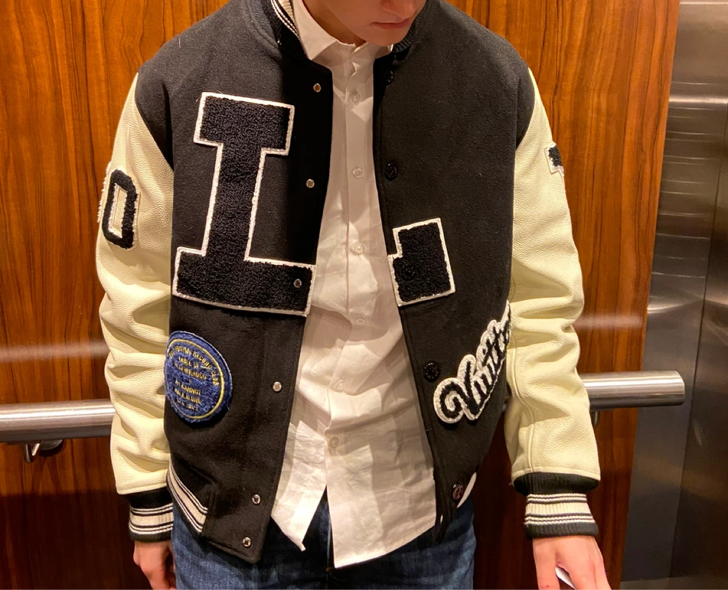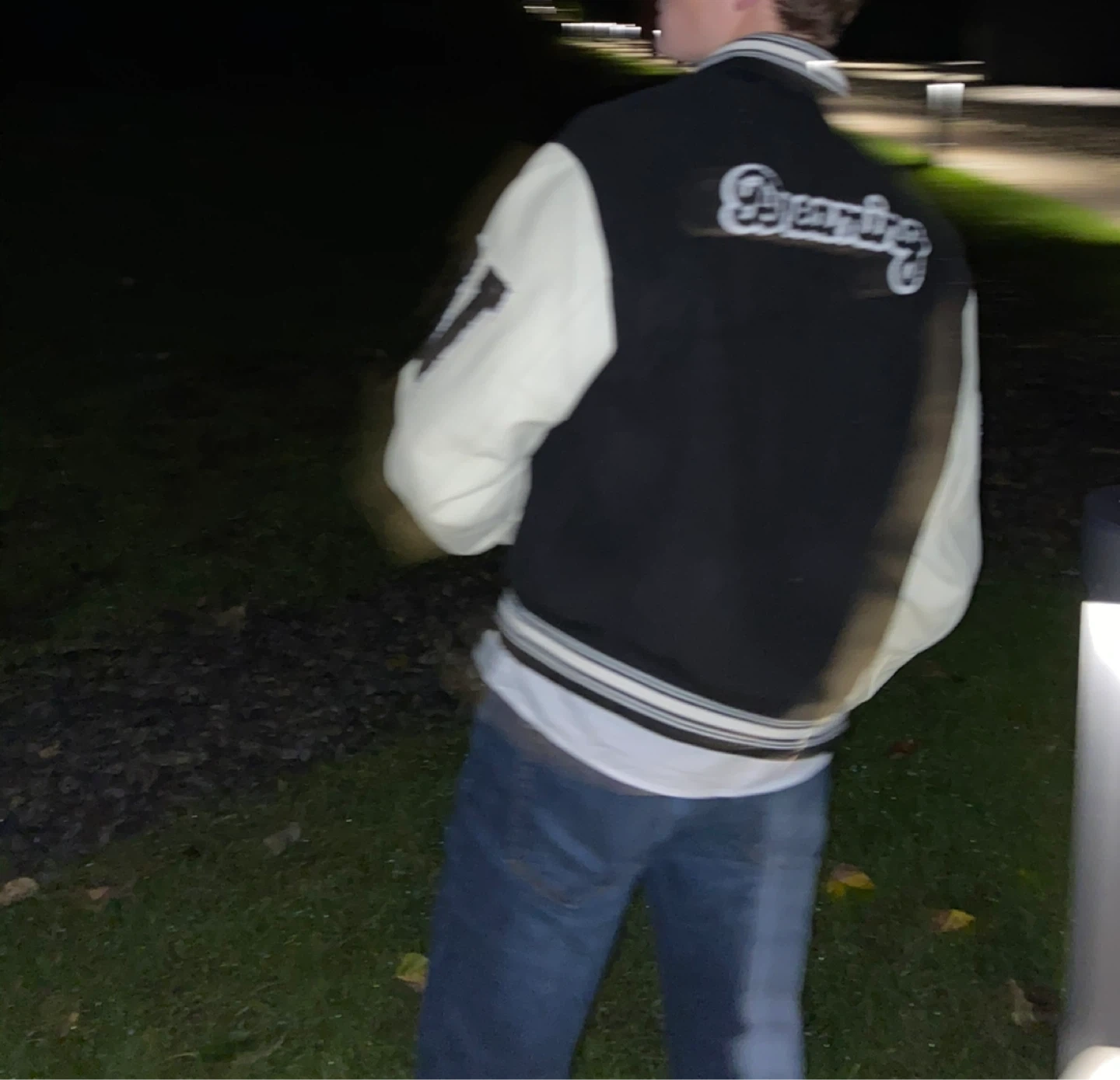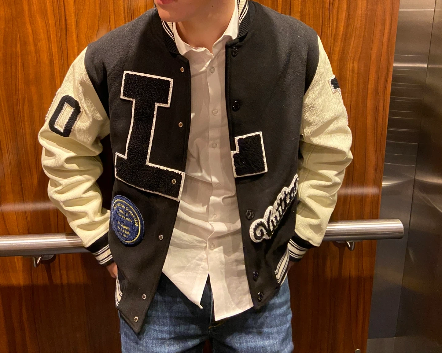 Selling a Louis Vuitton varsity jacket! It's in great condition, worn twice. But ready for a new owner. The jacket features a black body with cream-colored sleeves and the LV logo prominently displayed. It's a stylish piece that will definitely make a statement! Size Large. Comes with a navy zip up travel bag