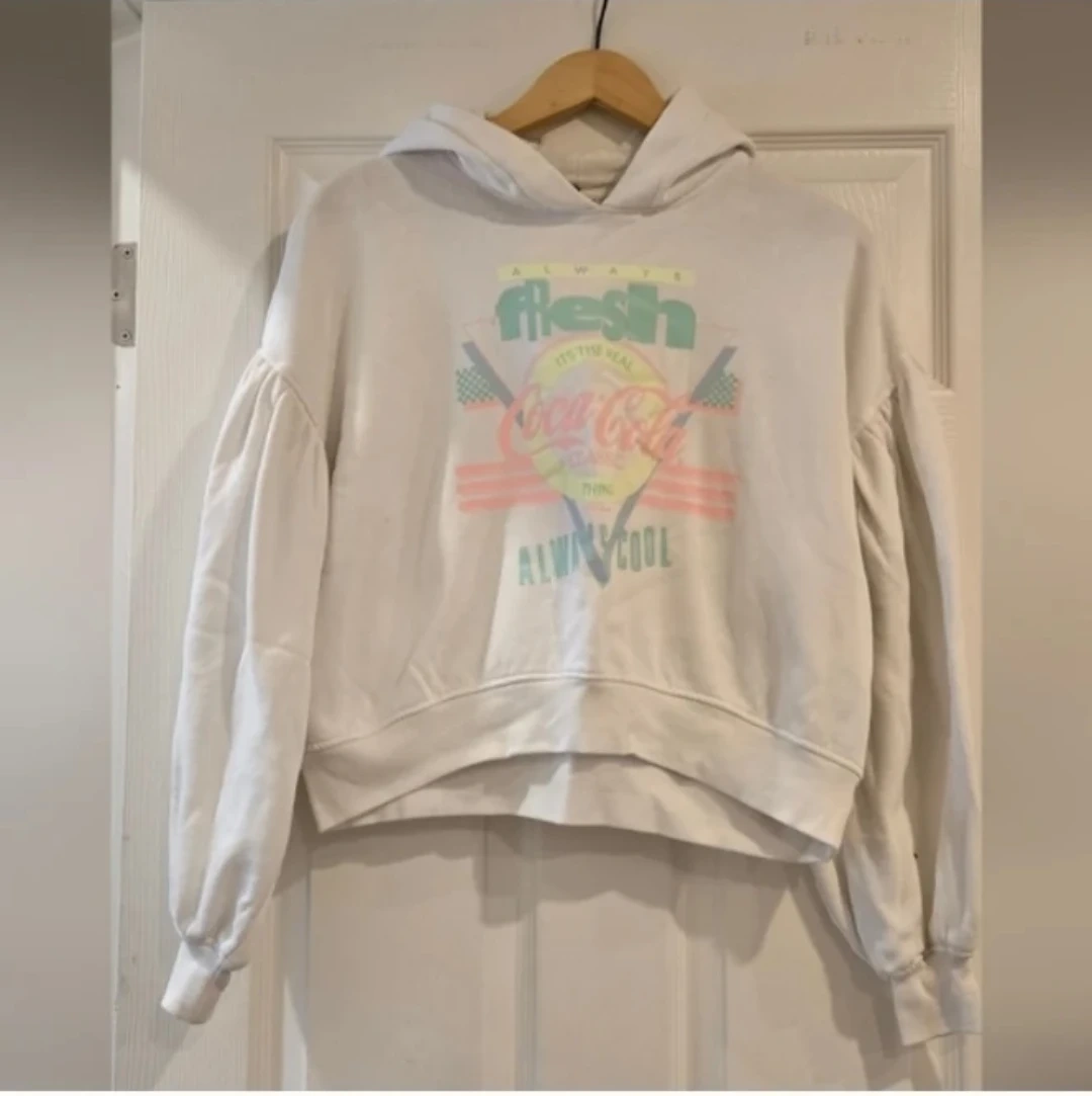 Selling a H&M Divided hoodie featuring a Coca-Cola design. It's a size M and in great condition! The hoodie has a unique style with its balloon sleeves and a fun, colourful graphic.
