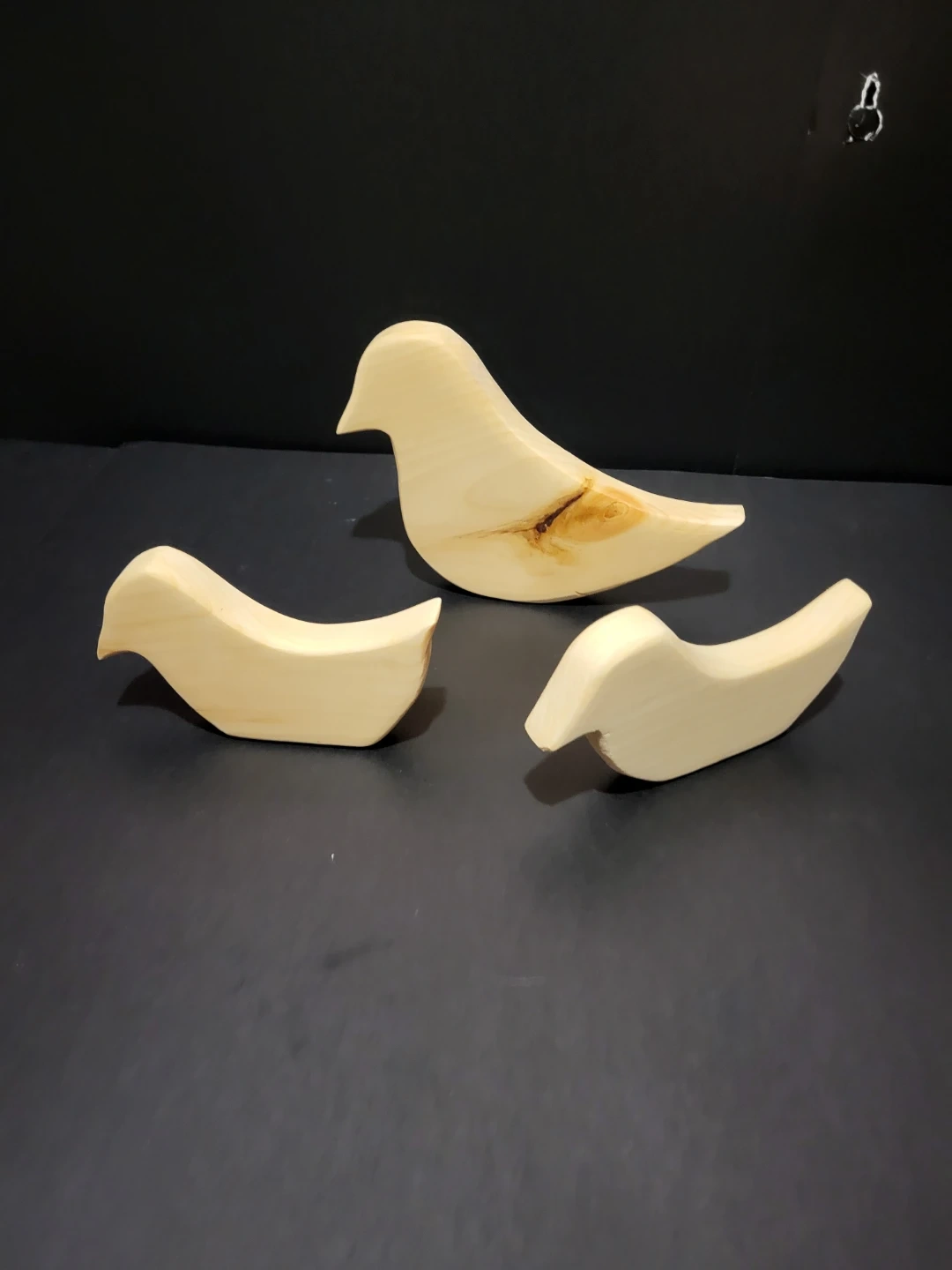 Here's a set of three cute wooden bird figurines! The largest one is about 6 inches long, perfect for adding a touch of nature to your home decor.