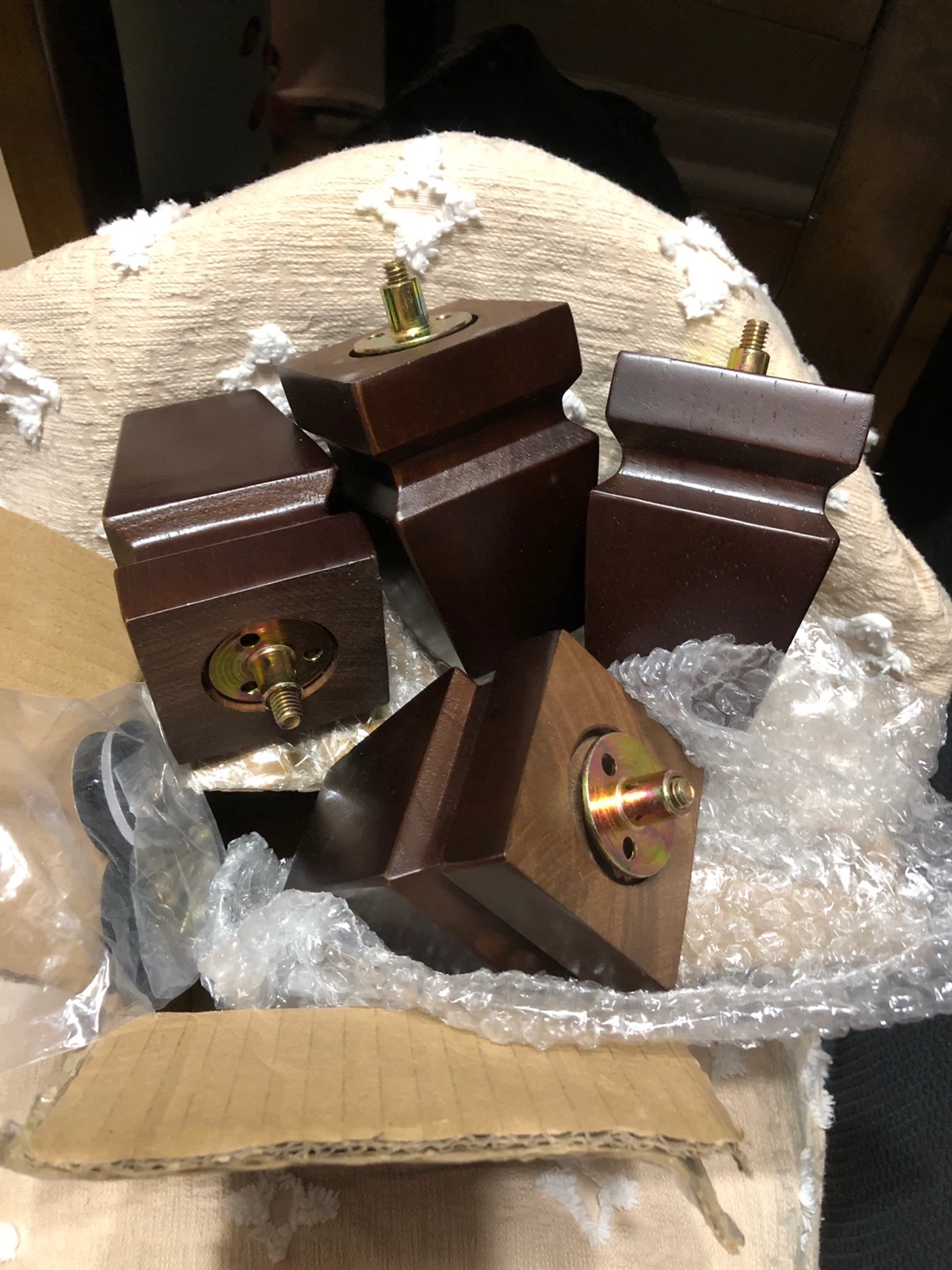Selling a new set of four dark brown wooden furniture legs. They appear to be in good condition and come with mounting hardware and adhesive pads. Perfect for replacing or upgrading the legs on your sofa, chairs, or other furniture!