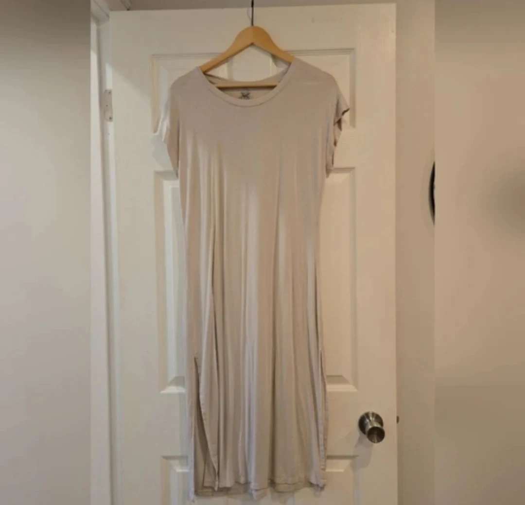 Selling a beige dress in size small. It's in great condition and has a comfortable, relaxed fit. Perfect for casual outings or lounging at home!