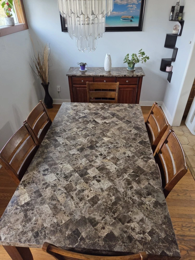 Selling a dining room set that includes a table and chairs. The table has a unique patterned top, and the chairs are a classic design. Perfect for family dinners or gatherings!