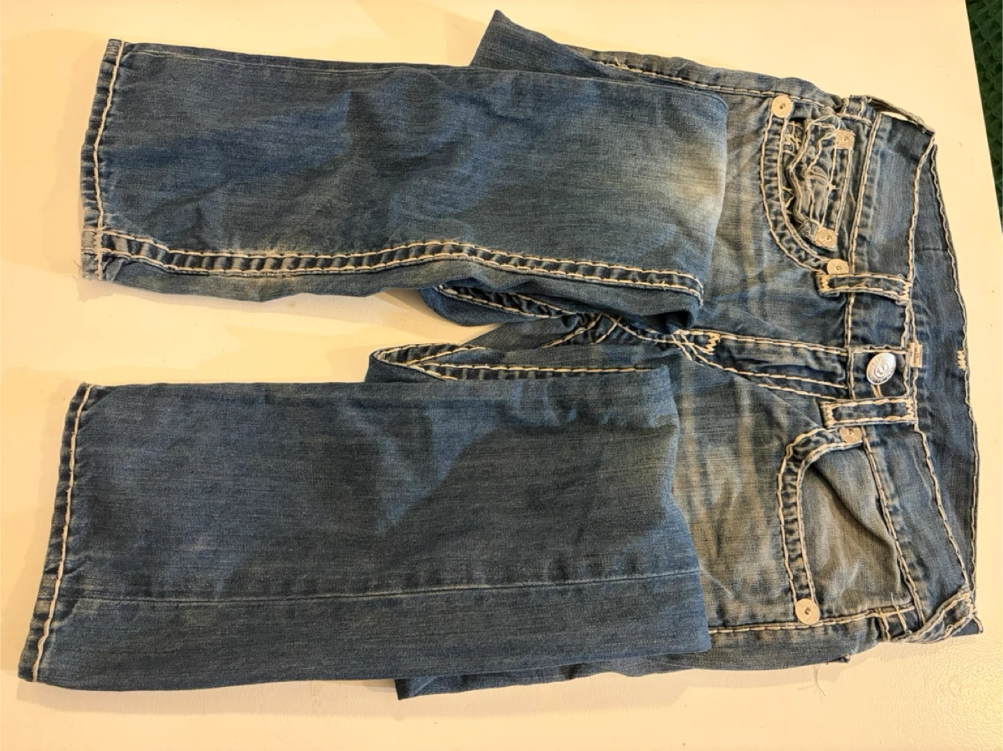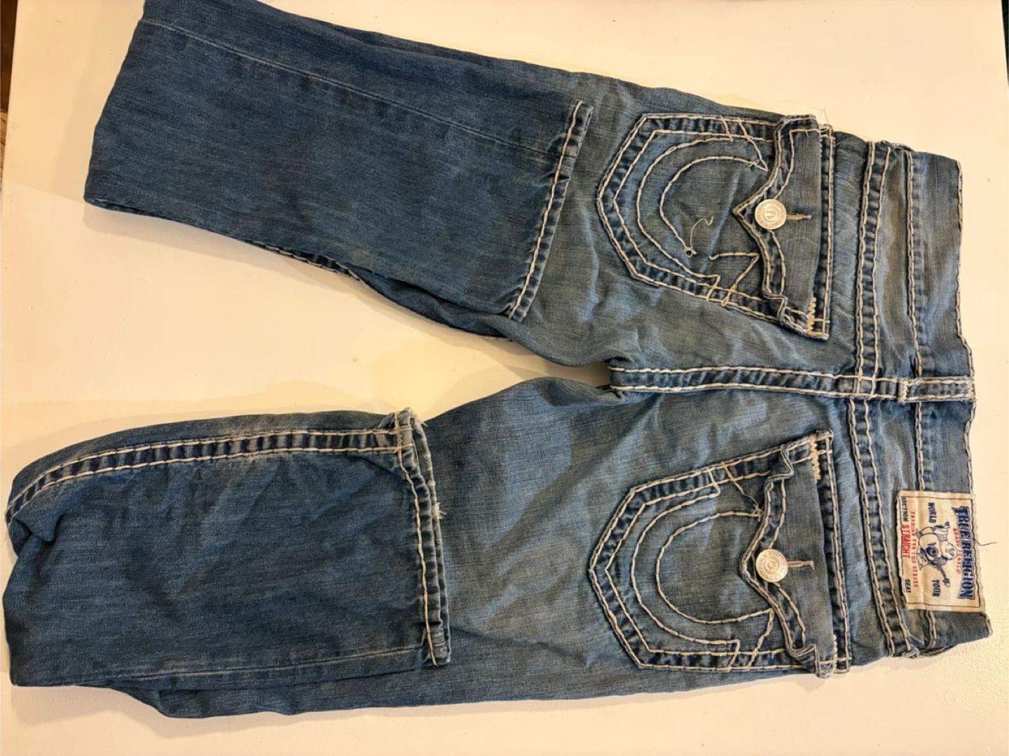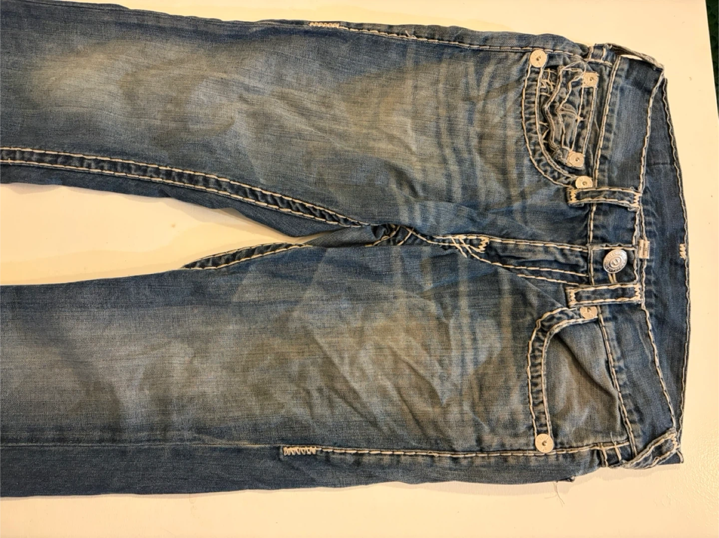 Selling a pair of True Religion jeans. They are a light wash denim with the signature horseshoe stitching on the back pockets. The jeans are a 'Straight Seat' style and were made in Mexico.