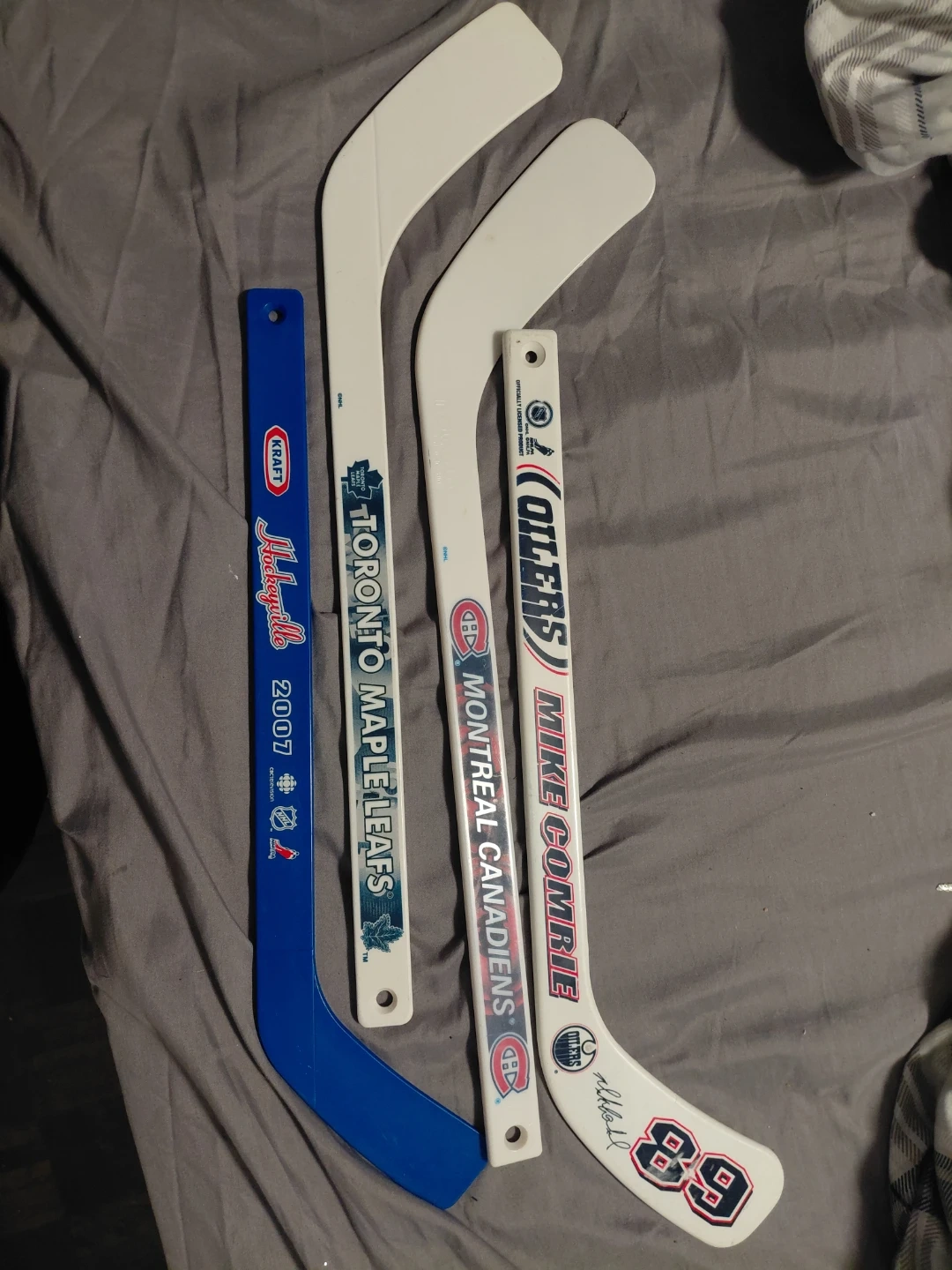 Selling a set of vintage hockey sticks! There's a Kraft Hockeyville 2007 stick, a Toronto Maple Leafs stick, and an Edmonton Oilers Mike Comrie stick. Great for a collector or hockey fan