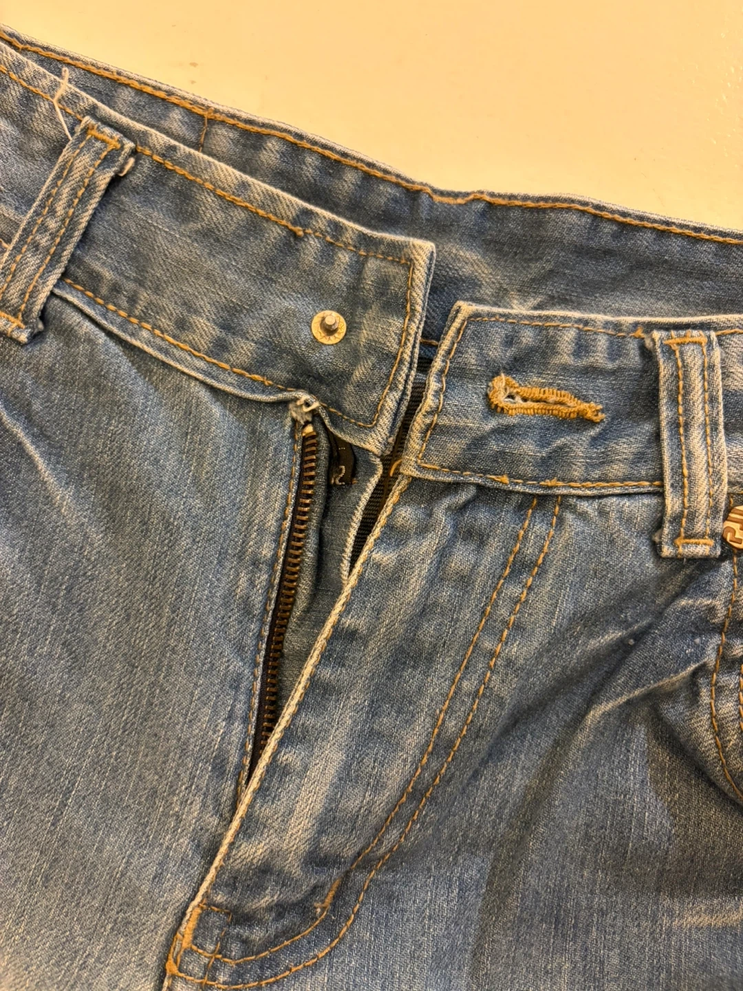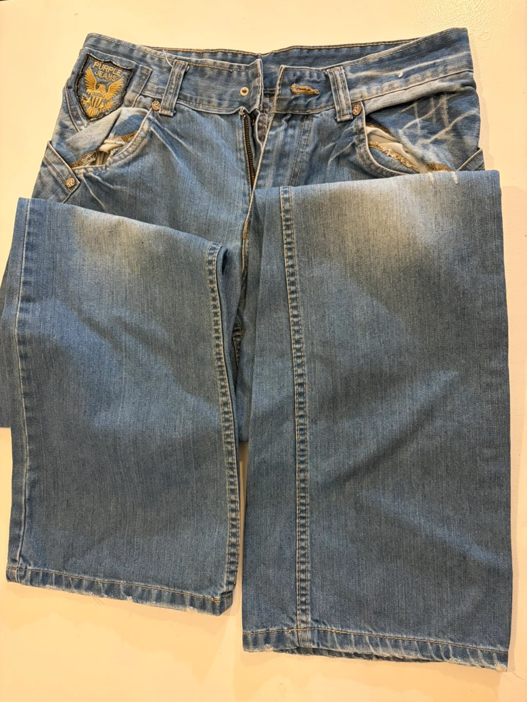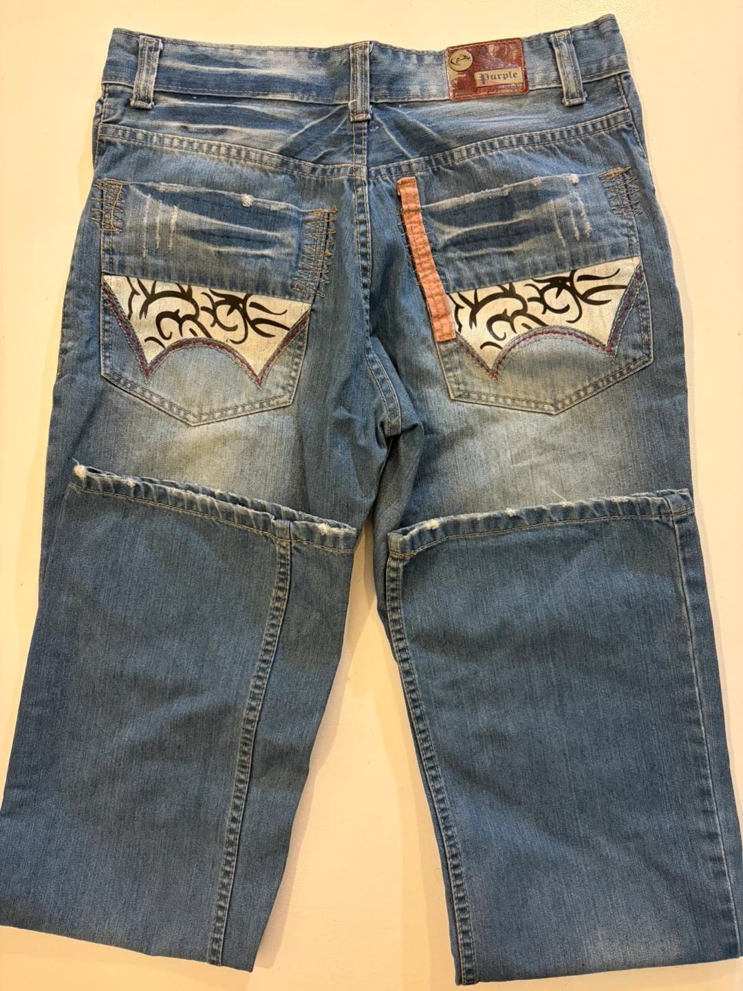 These are a pair of Purple brand jeans. They are blue and have a design on the back pockets. The button came off but zipper still works!